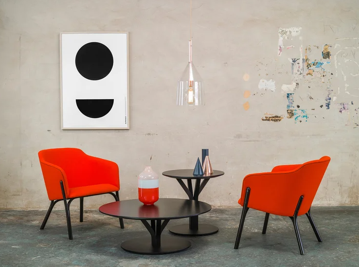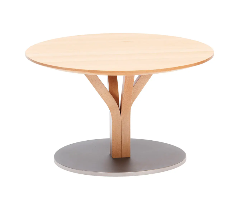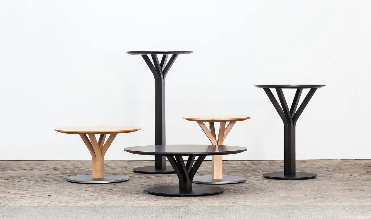Bloom central is a collection of tables in several heights that are suitable for use in private homes as well as restaurants and bars. The pedestal is made from four pieces of timber that branch outward like a flower in bloom, and supports a tabletop available in round and rectangular versions. Bloom central 275 is a coffee table variant with a pedestal height of 47.6 cm.