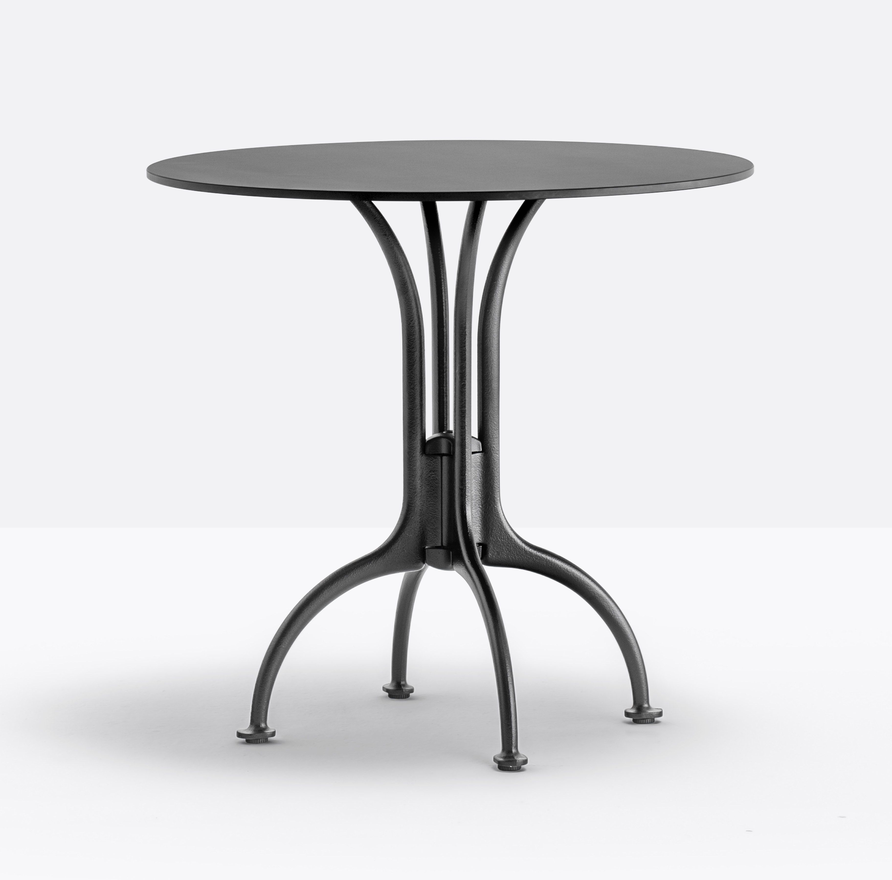 Table with four-spoke bases made of sand-blasted cast iron powdered coated. It can be combined with tops of different sizes and finishes. Available in the outdoor version too.