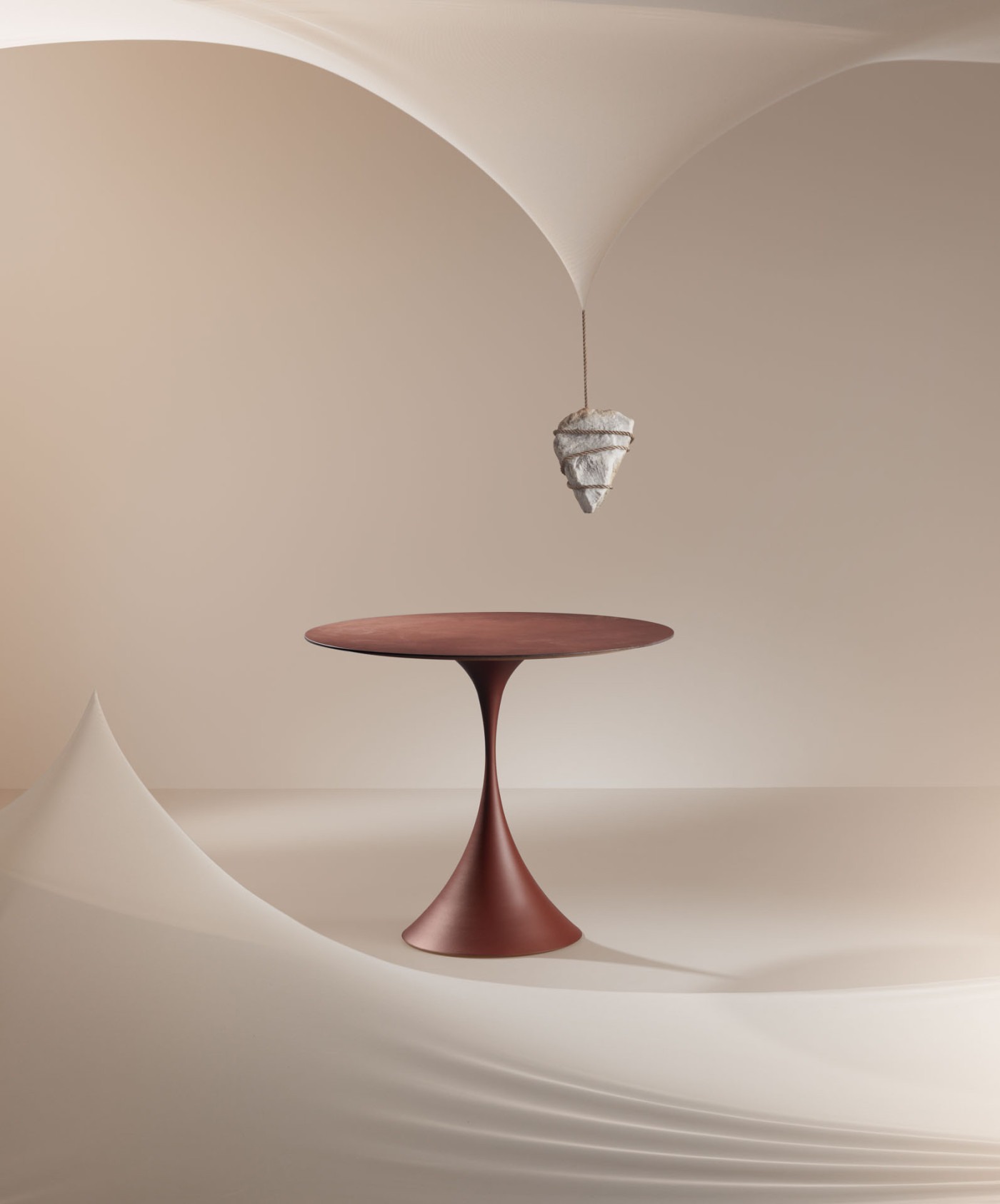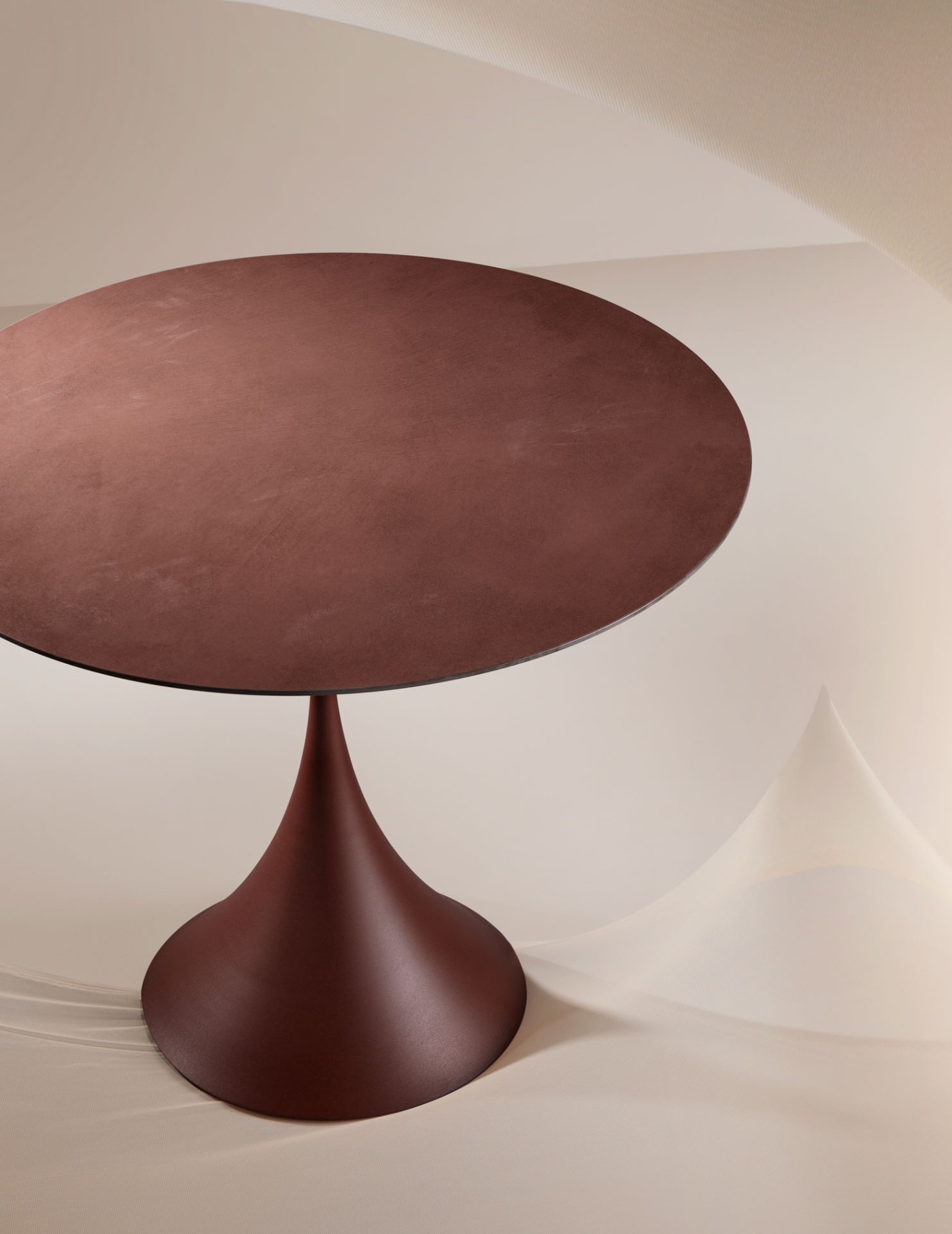 Leo bistro table with metal base and round top available in different finishes such as HPL, veneer, ceramic, and marble.