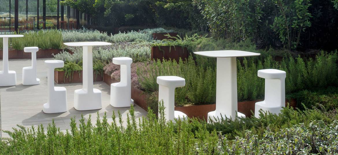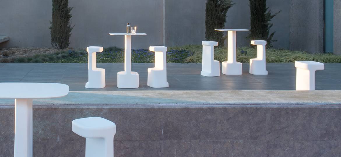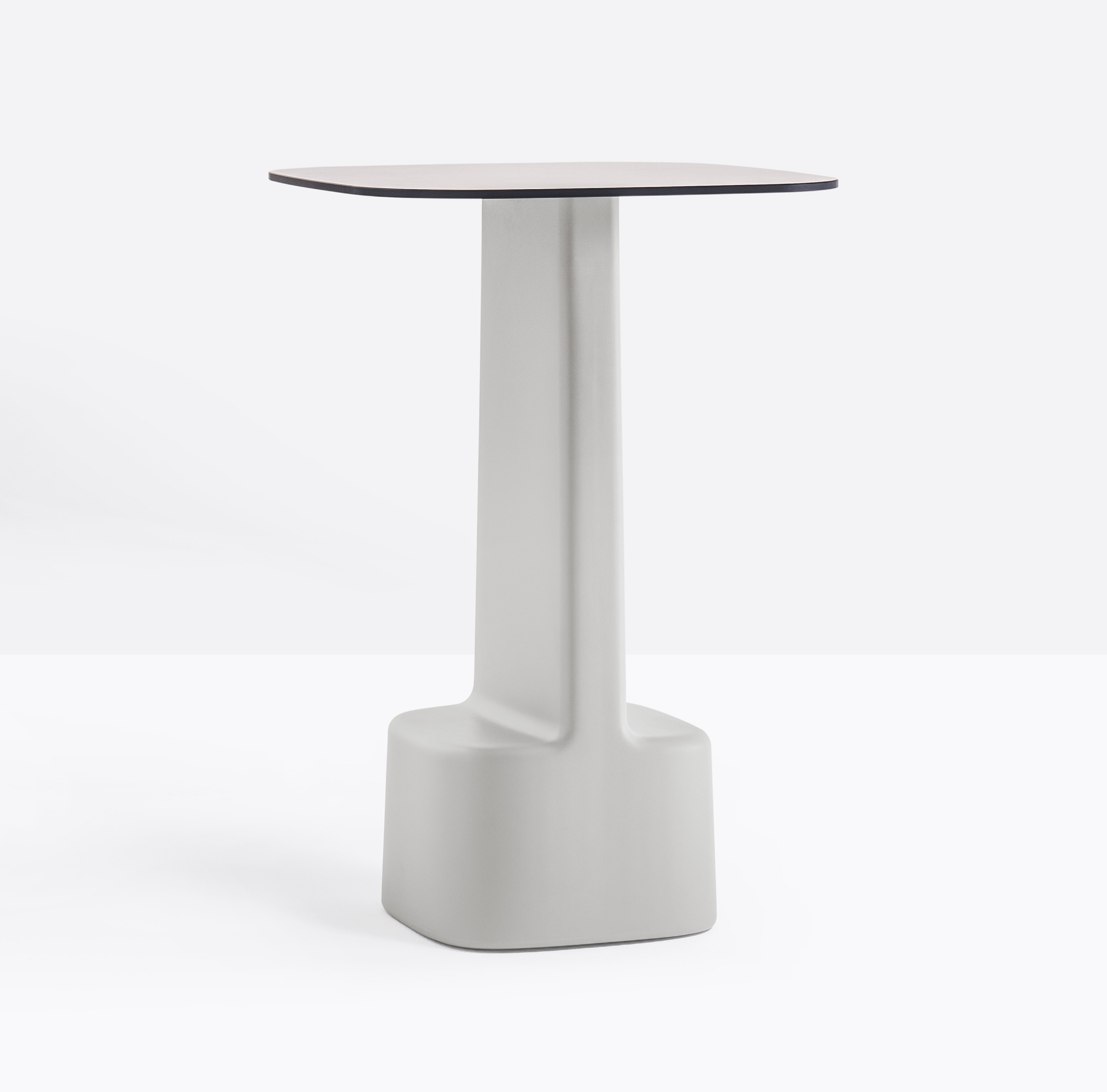 Table made of rotomoulded polyethylene with solid laminate top. It declines the architectural style of Serif’s barstool preserving optimal features of functionality.It is available in white and light gray.