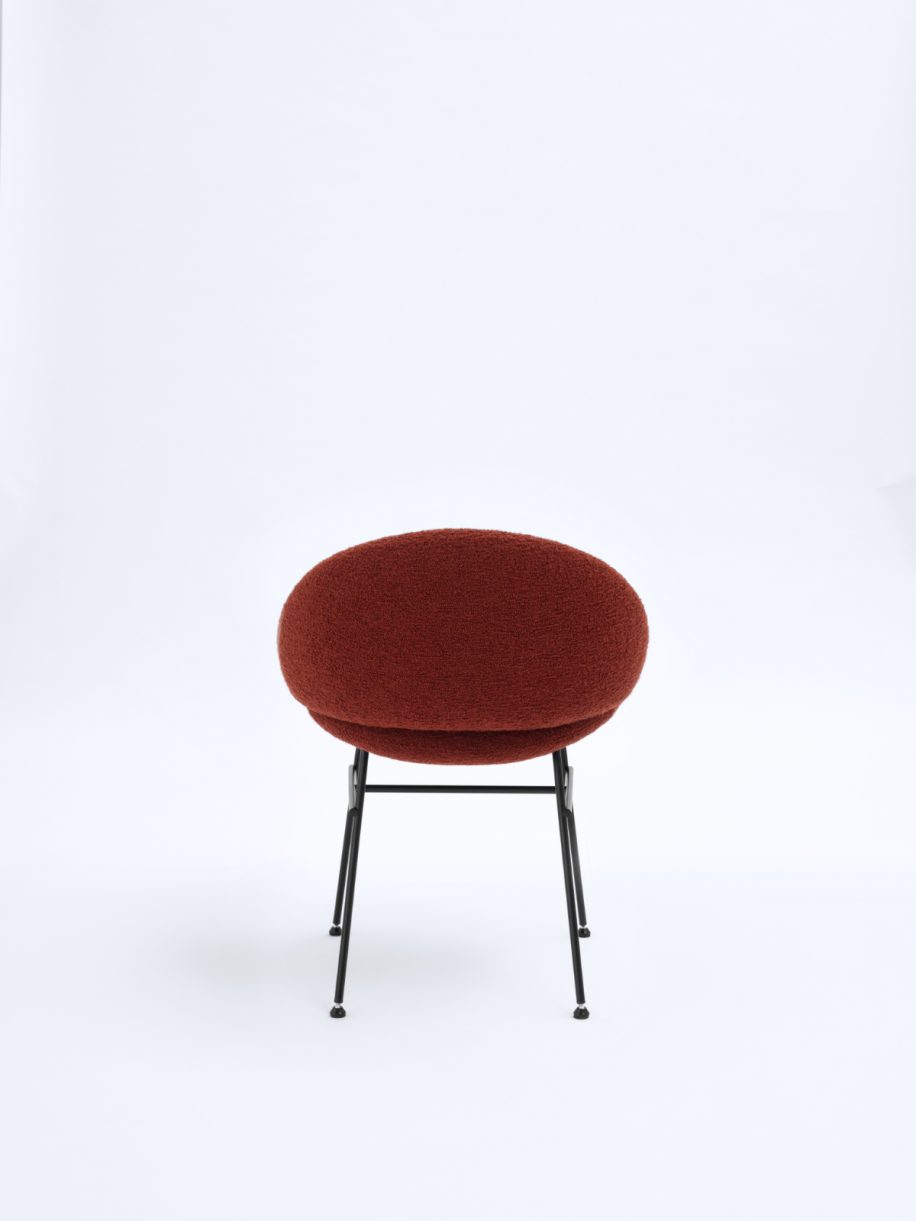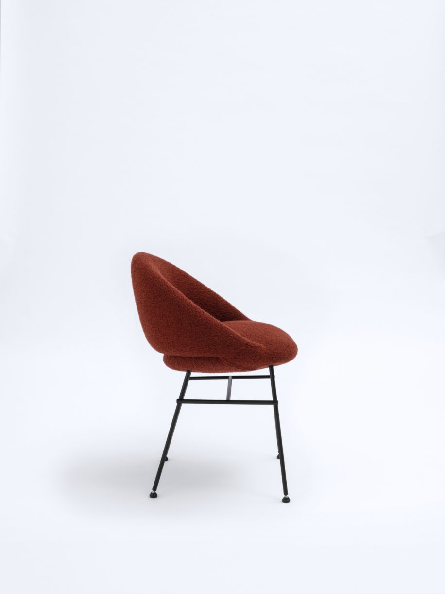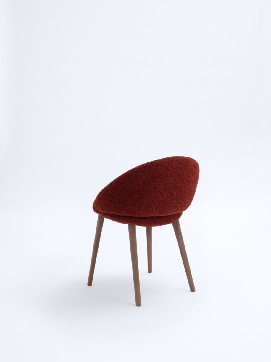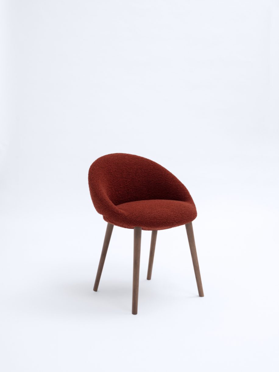 Cloche armchair is designed for a contract environment that evokes domestic scenarios. The soft shapes and proportions of this model let it sit perfectly next to a table in domestic and contract settings, giving style and comfort. The legs of Cloche are proposed in a calssic version, in wood featuring a conical section, or in metal, with tubular elements that intersect, providing lightness and solidity. The elegance of Cloche is enhanced by soft textile upholstery, available in a carefully devised range of shades that give it personality and character.118/B1 ~ Chair: solid wooden legs. Padded seat and backrest.118/B2 ~ Chair: solid metal legs. Padded seat and backrest.