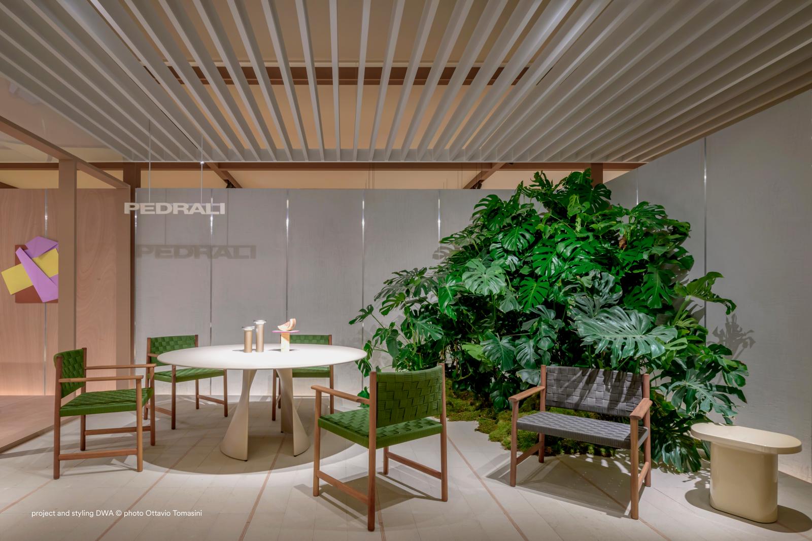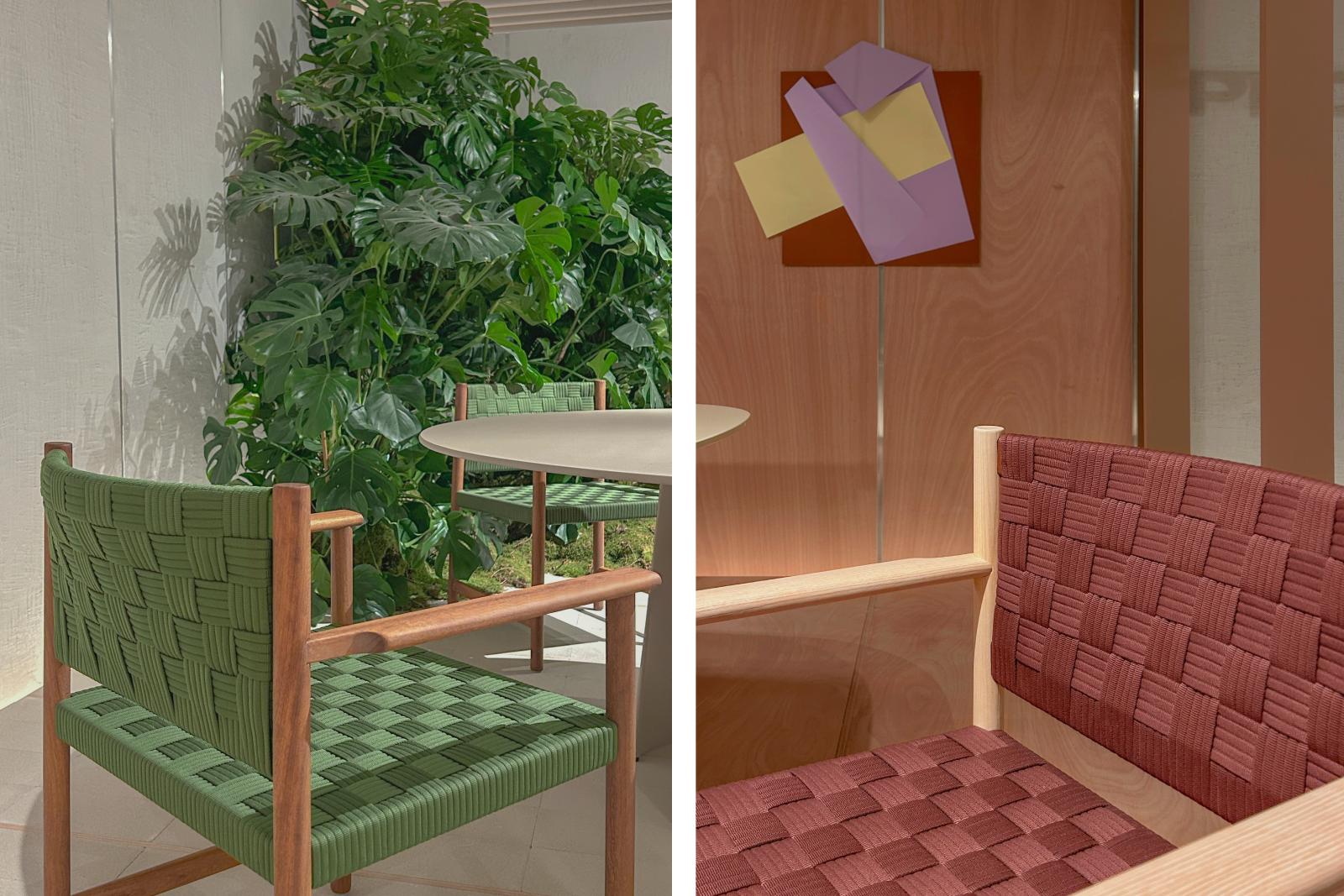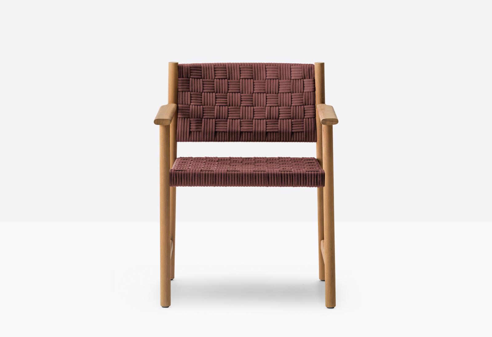 Griante reinterprets the concept of woven seating through a design that combines traditional craftsmanship and industrial production. Outdoor armchair with a frame made of teak, a refined variety of wood, FSCĀ® C114358 certified. The cylindrical legs are turned, and the oval-shaped armrest is tapered where it joins the back leg. The aluminium frame provides support for the seat. The main feature of Griante is the handwoven seat and backrest made in Italy, with a fully recyclable polypropylene yarn belt with a three-dimensional texture, ensuring comfort and weather resistance, while being easy to disassemble. The woven pattern is characterised by the repeated use of geometries of squares, that highlights the generous proportions of the seat, creating a sophisticated and welcoming look.