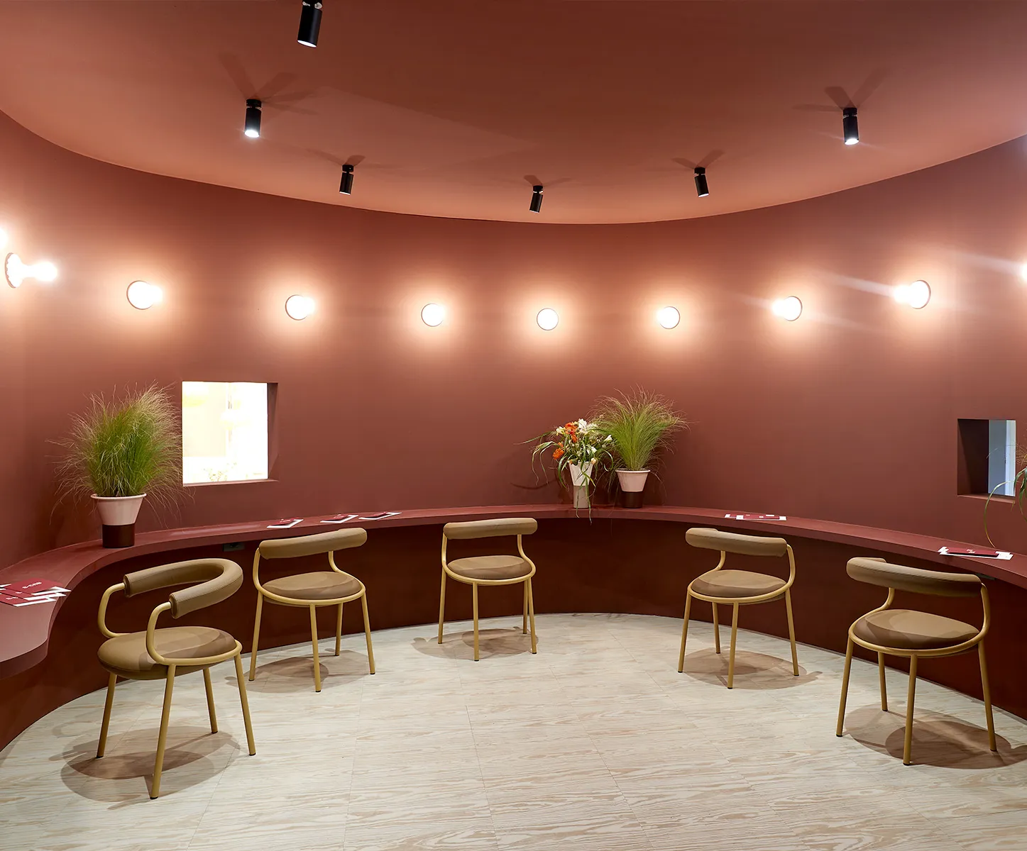 The open version of Koala highlights the graphic quality of the tubular metal frame, which traces the shape of the seat in an enveloping embrace – hence the name Koala, inspired by the Australian marsupial known for its close bond with its young.