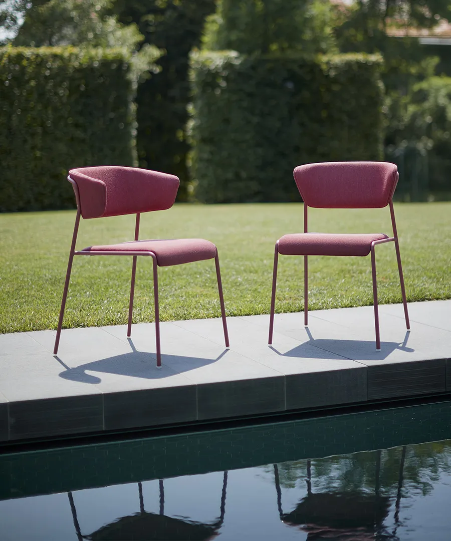The big Lisa family widens towards the outdoor. The new version Waterproof is characterized by the brand-new coverings for outdoor use in four colours with matching tubular steel structure to play with the tones of sand, olive green, azure and marsala.