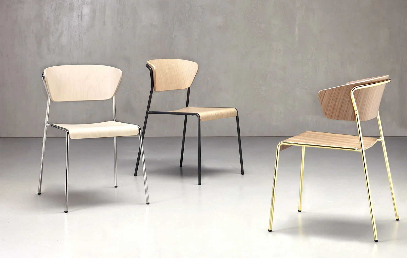 The Lisa chairs are inspired by the elegant interiors of the 1950’s and 60’s. The slimline tubular structure envelops and supports the backrest of both the armchairs and chairs, featuring a padded or wooden seat. Lisa fits effortlessly into any contract or household setting thanks to the use of sophisticated finishes and materials.