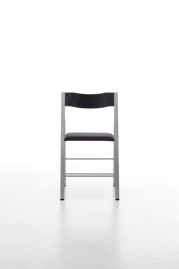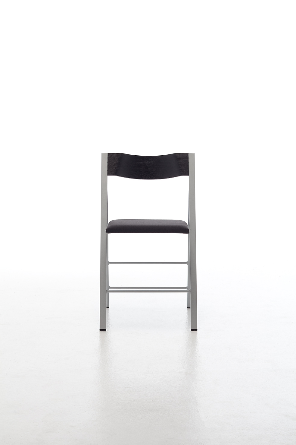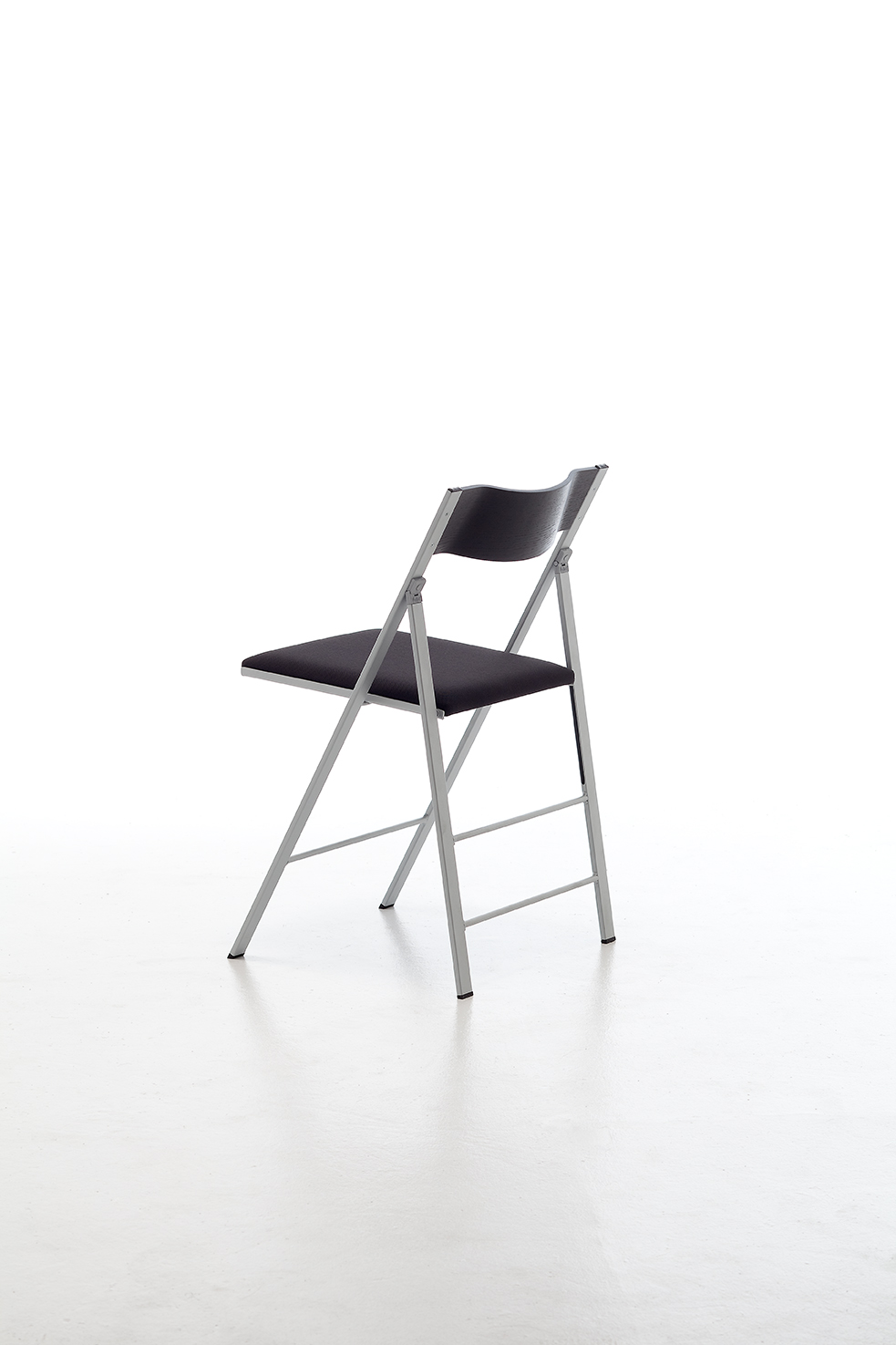 Folding chair with chromed or painted steel frame, upholstered seat with flame-retardant polyurethanefoam and beech or ash backrest.
