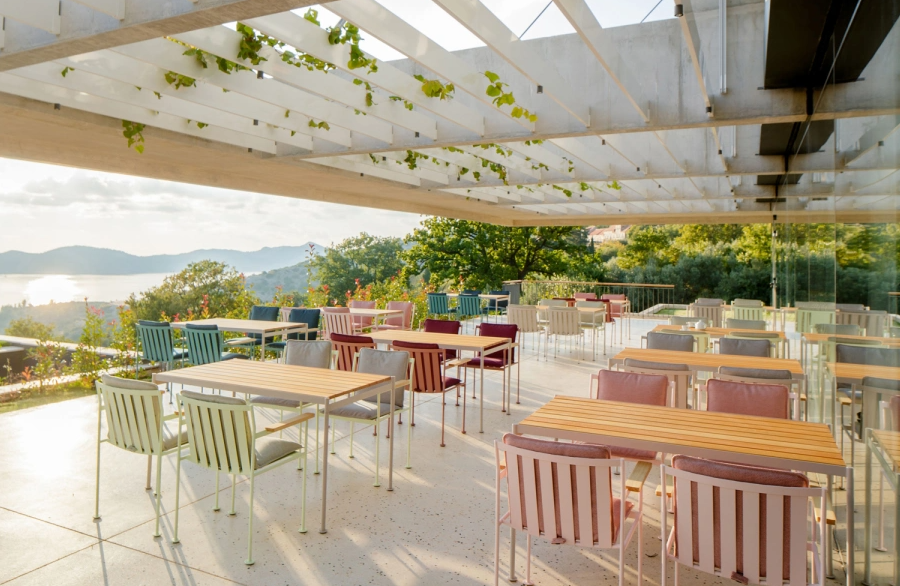 The Jugo outdoor collection is reminiscent of the Mediterranean laid-back spirit evoking the need for hedonism. The collection is designed to contrast the rational and almost ascetic powder coated construction made of stainless steel to the oversized wooden armrests and lavish cushions. The seat and the backrest are inclined at an angle that provides high-level ergonomics in the seating position. The solid wood armrests of both the Jugo easy chair and sun lounger are characteristically wide. Their width almost matches the dimensions of the tray tables that can be used for putting away a glass with your favourite drink. This feature gives the easy chair a very specific, relaxing and lavish trait. All surfaces for tables and low tables are made from wooden and metal slates, selected as durable materials that mature gracefully. Distinctly accentuated discs on the legs are another characteristic design feature whose function is to ensure various modalities of use on soft or sandy surfaces. The name of this outdoor collection has been inspired by „jugo“ – a characteristic wind blowing from the southeast, also known as the wind of 'fjaka' that literally translates to „doing nothing“.