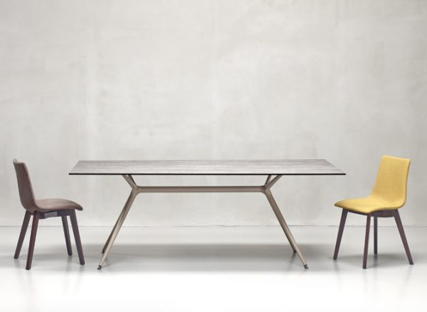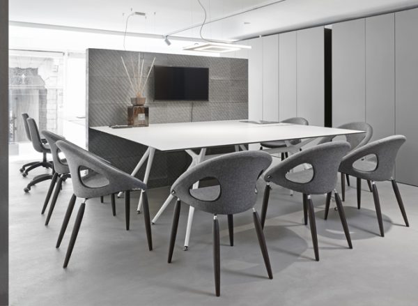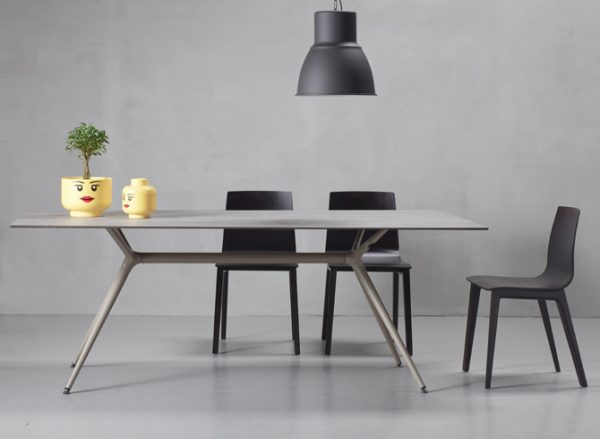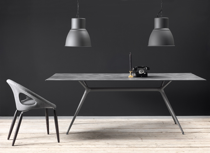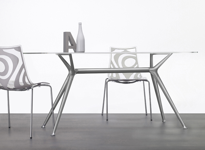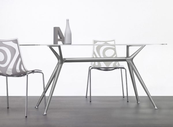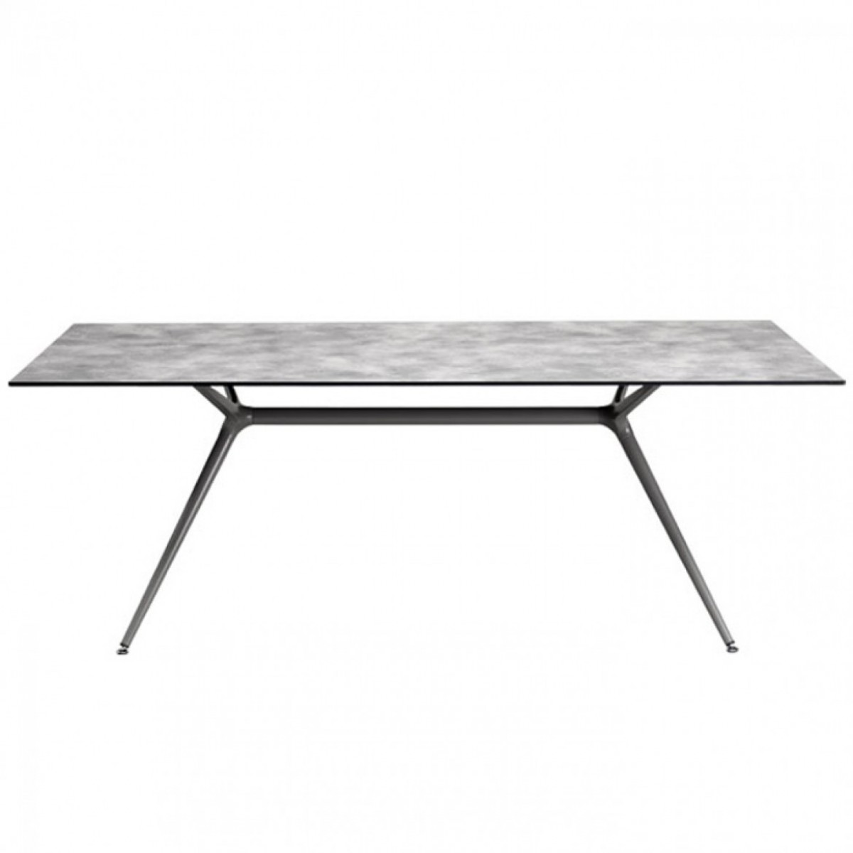 Base for table with compact laminate rectangular top. Mat coated structure. Steel legs and cross bar. Top supports in polished die cast aluminium. Swivelling and adjustable feet. Dimensions: 210x100xh.75.