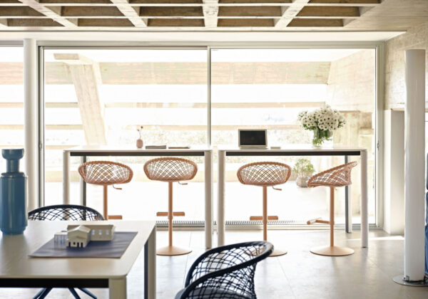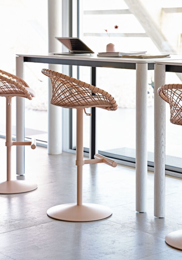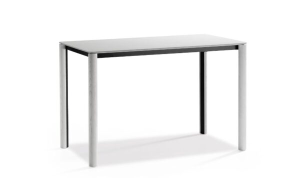 Woody fixed table with four-legged base in stained ash wood with lacquered metal core. Metal structure. Top in veneered wood, fenix, laminate, crystalceramic or glass.