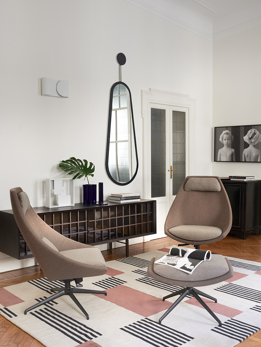 Lounge armchair available in the version swivel or fixed and footrest characterized by the central base in embossed black painted aluminum and padded in fire retardant polyurethane foam. Covers as per collection.