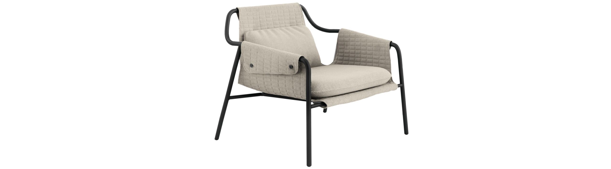 Drawing evident inspiration from the fashion world, Jacket armchair now appears in a renewed version, with revamped sartorial details and new colours for its sleek and slender metal frame. The quilted fabric, in addition to dressing the piece, forms its soft, cosy shell, with edging reminiscent of a jacket lapel. Two cushions add a sense of snug comfort.