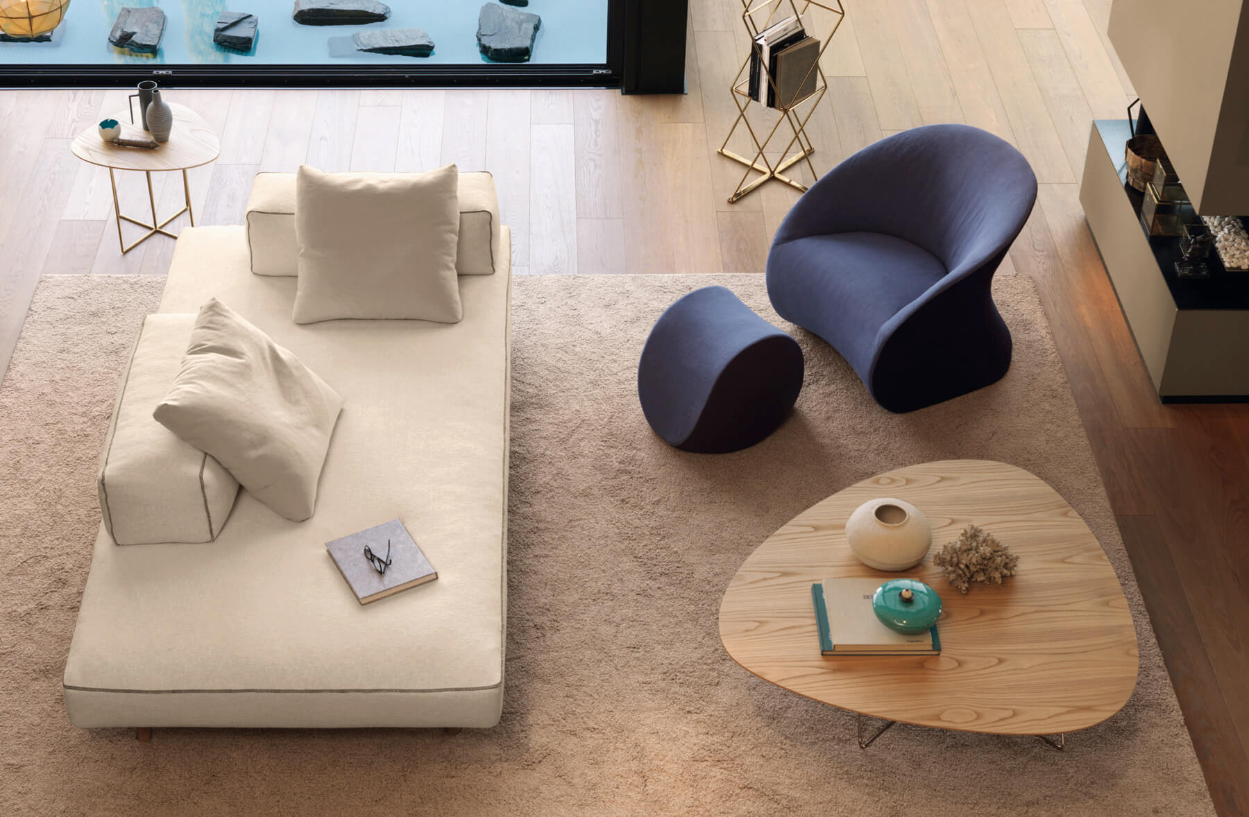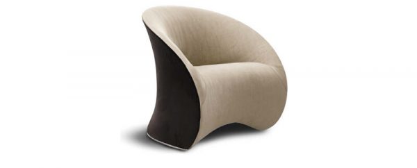 Curvy lines and cosy comfort for the dynamic two-tone, fabric or fabric, decò and leather upholstered armchair with complementary pouf.