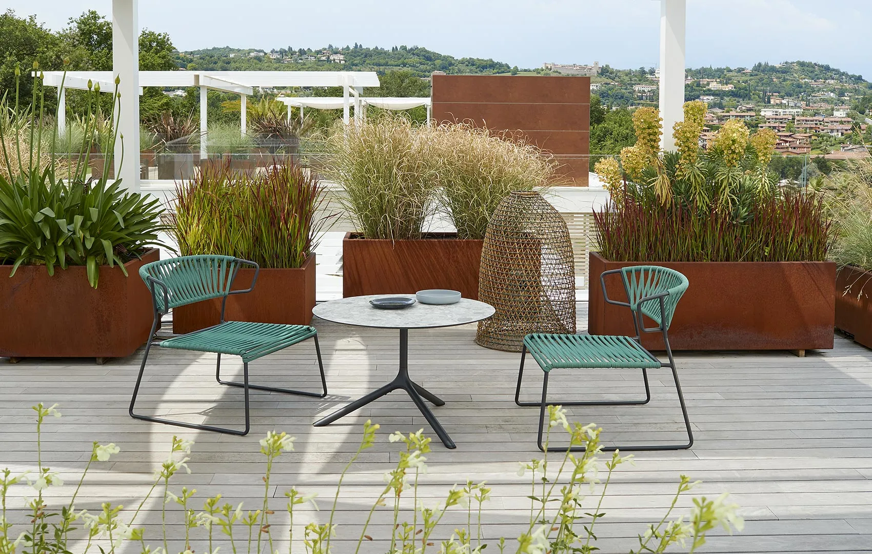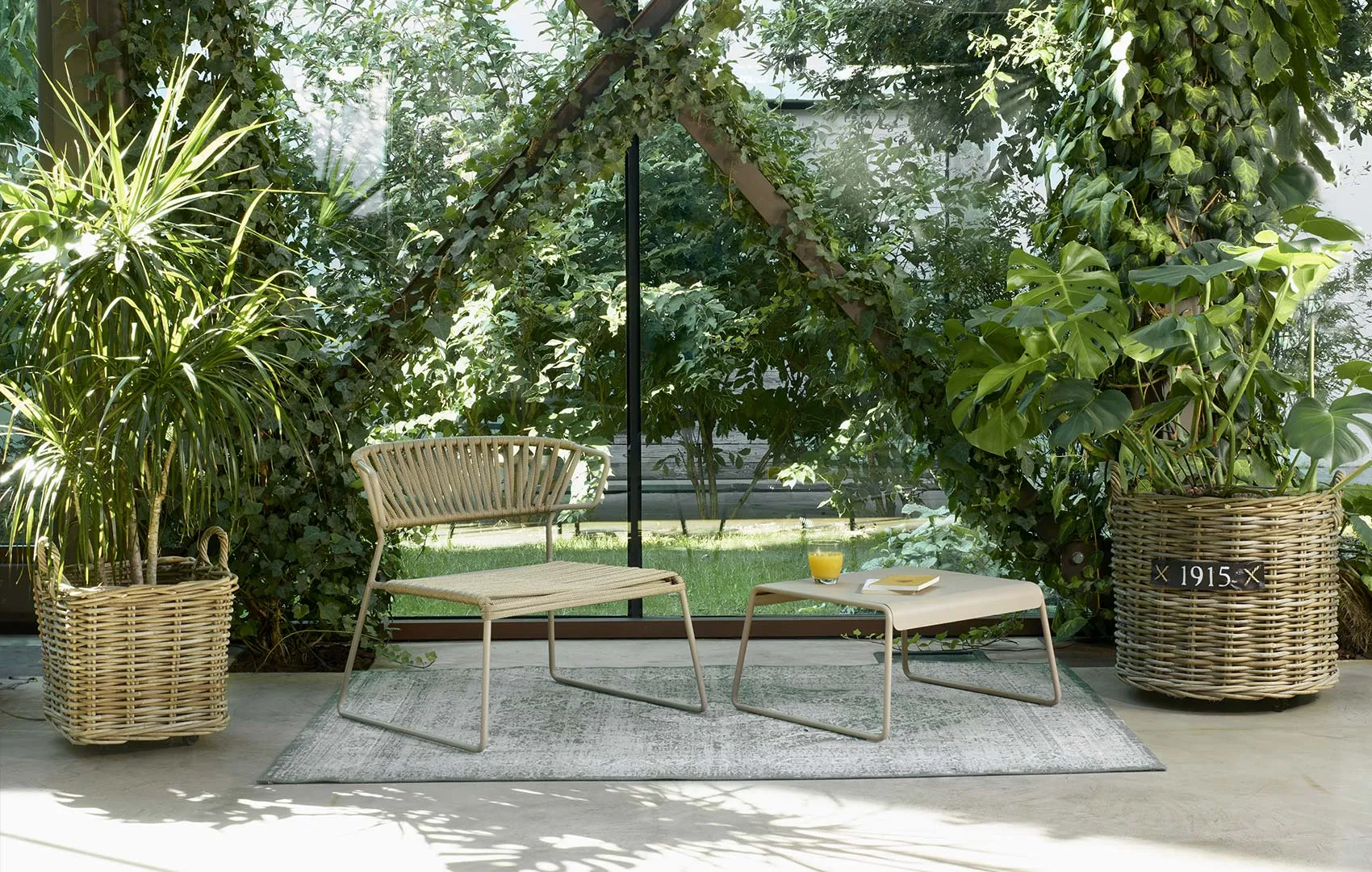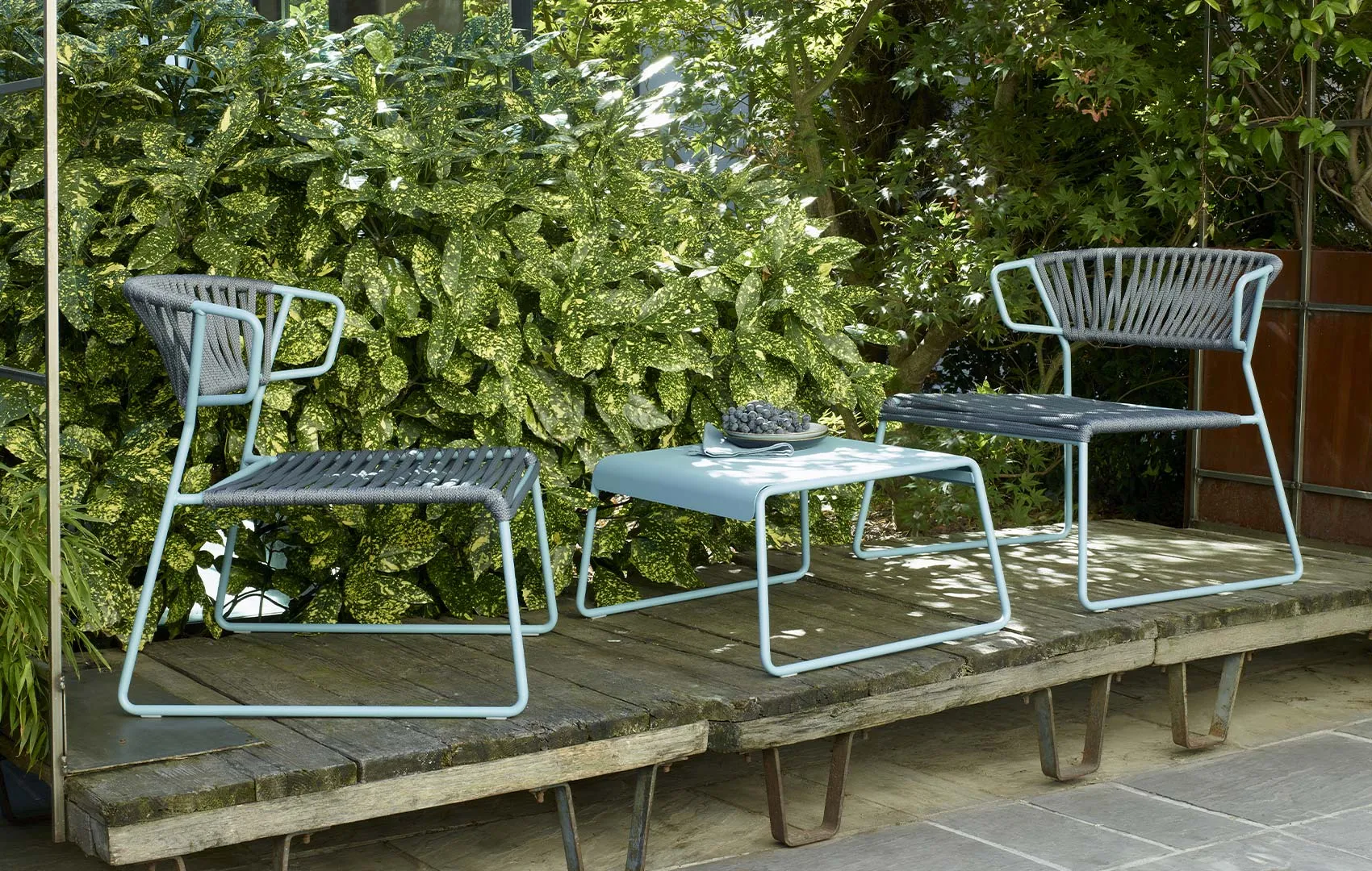 A cozy lounge armchair, expertly woven in nautical rope ribbon, suitable for relaxation in outdoor spaces. Side table in coated galvanized steel. Attractive, as well as useful: the top of the side table which simply rests on the frame, with the edges facing either up or down as preferred, can double up as a handy tray.