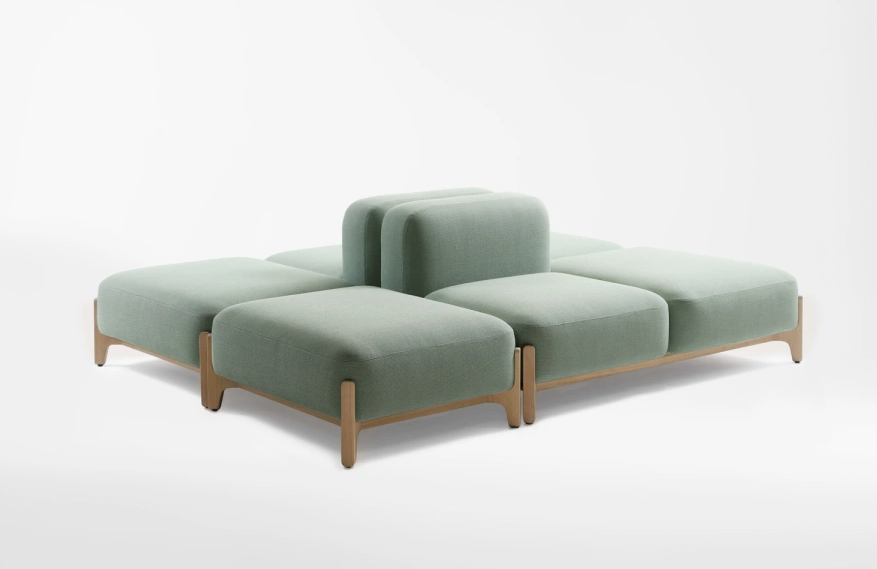 Sabot can be configured to create linear two-, three-, or four-seat sofas and asymmetrical S-shaped configurations that allow for added privacy between seating. The modules can also be connected together to form islands or clustered arrangements. These flexible configurations of low table tops, poufs, and seating modules offer mixed capacity seating for dynamic spaces, such as break-out areas, lobbies, and receptions.