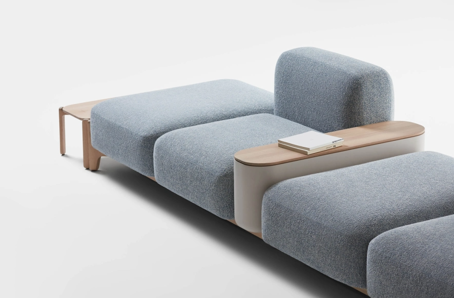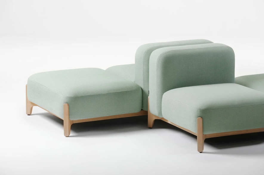 Sabot is a playful arrangement of abstract volumes supported by characterful timber feet that are a celebration of Prostoria’s woodworking capability. The modular sofa system takes its name from a type of simple, timber shoe – a nod to these wooden feet. The soft and approachable design language is inspired by residential interiors, and brings a strong playful identity to commercial spaces. Each module has a super-soft, friendly silhouette that floats above the exposed timber legs in a cloud-like way, and these modules can be combined to create linear or island configurations. The movable side accessories – including tables and dividers – mimic the floating language of these seating modules, while planters offer the ability to create green privacy screens.