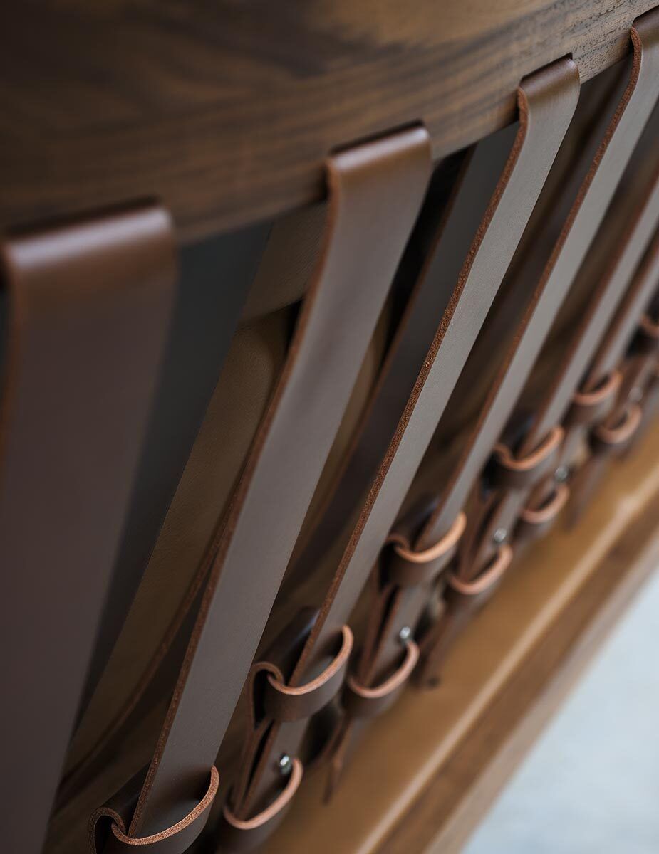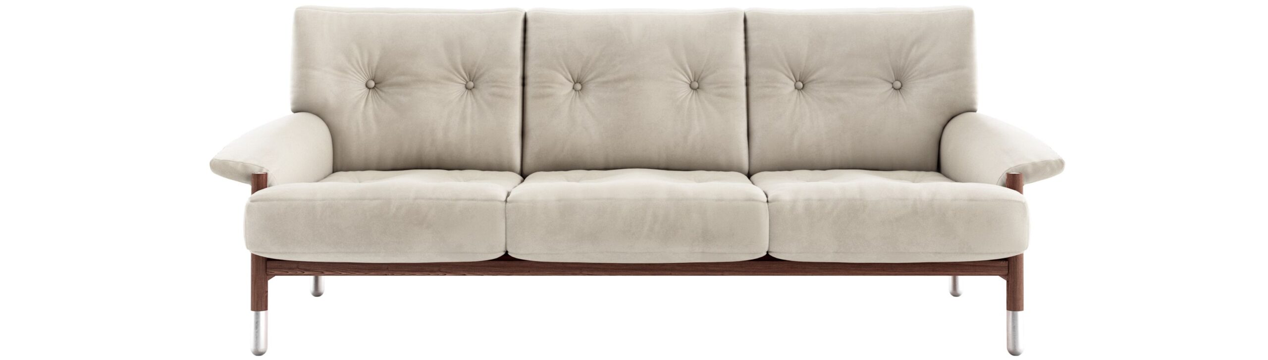 Sella is inspired by the armchair of the same name designed in 1966 by the famous Italian architect Carlo De Carli. The highly elegant sofa is made using the very finest of materials: exposed walnut, elegant metal chromed details finish shiny black and belts for the support of the backrest in refined natural leather. The cushions are filled with feathers, and the coverings could be in leather, fabric or velvet. Its soft, generous line offers the utmost refinement, and is designed to guarantee extraordinary comfort, conducive to a slow tempo that will reconcile us with ourselves and others, in a more intimate and private spatial dimension.