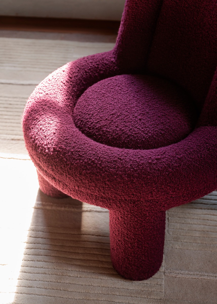 The cylindrical legs follow the entire silhouette of the armchair, outlining the perimeter of the circu-lar seat and continuing to the sides of the backrest, which features a curved and enveloping profile. The internal structure ensures strong durability, while the padding and upholstery provide comfort and softness.