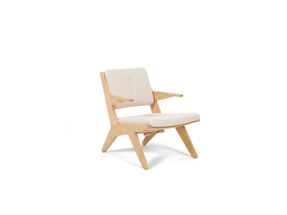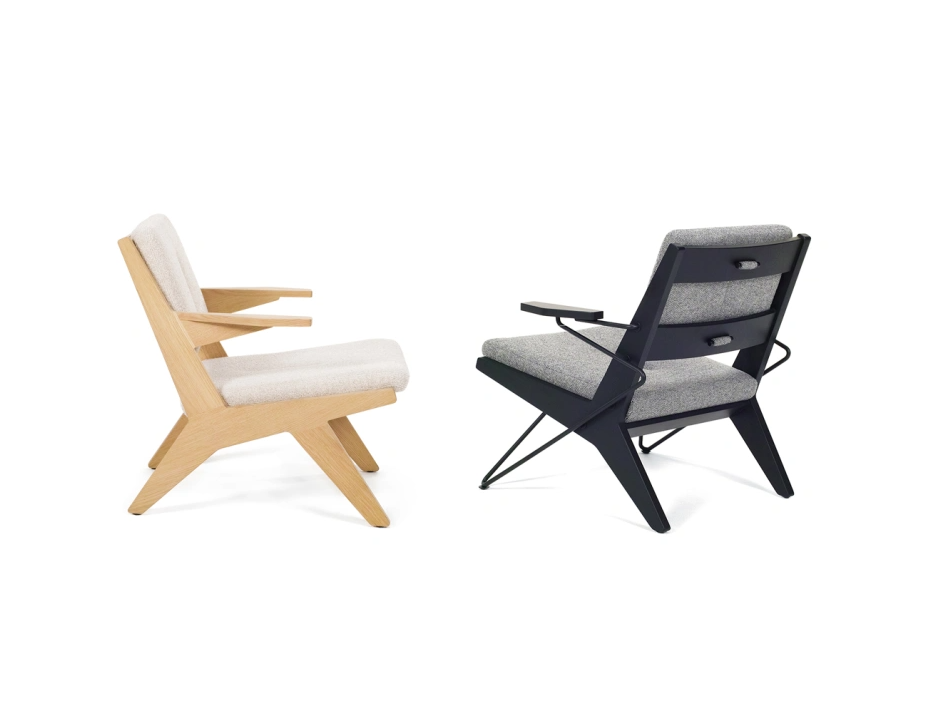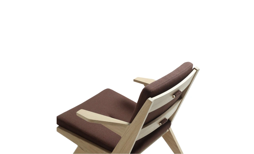 Toggle is an unpretentious armchair of small dimensions whose character entirely rests on the star-shaped composition of its profile. The three basic radial triangles of its structure extend into its front legs and the armrest, providing an aesthetic and static balance to the chair. The removable cushions attach to the wooden base with strip-shaped gussets connected by a cylindrical plug, the Toggle. Depending on the treatment of the wood and the selection between the wooden or steel front legs, the armchair changes its appearance, adapting to its surroundings and purpose.