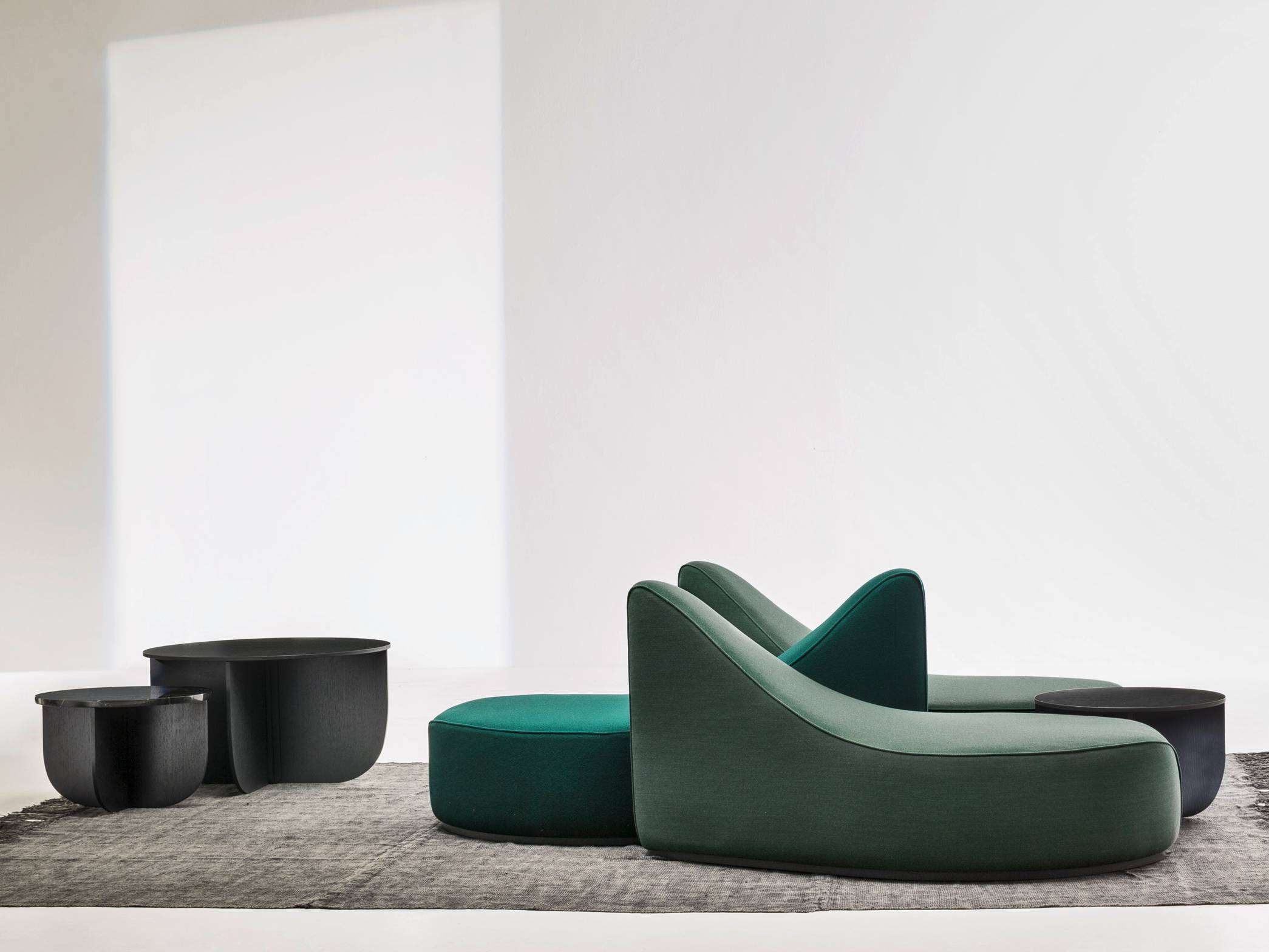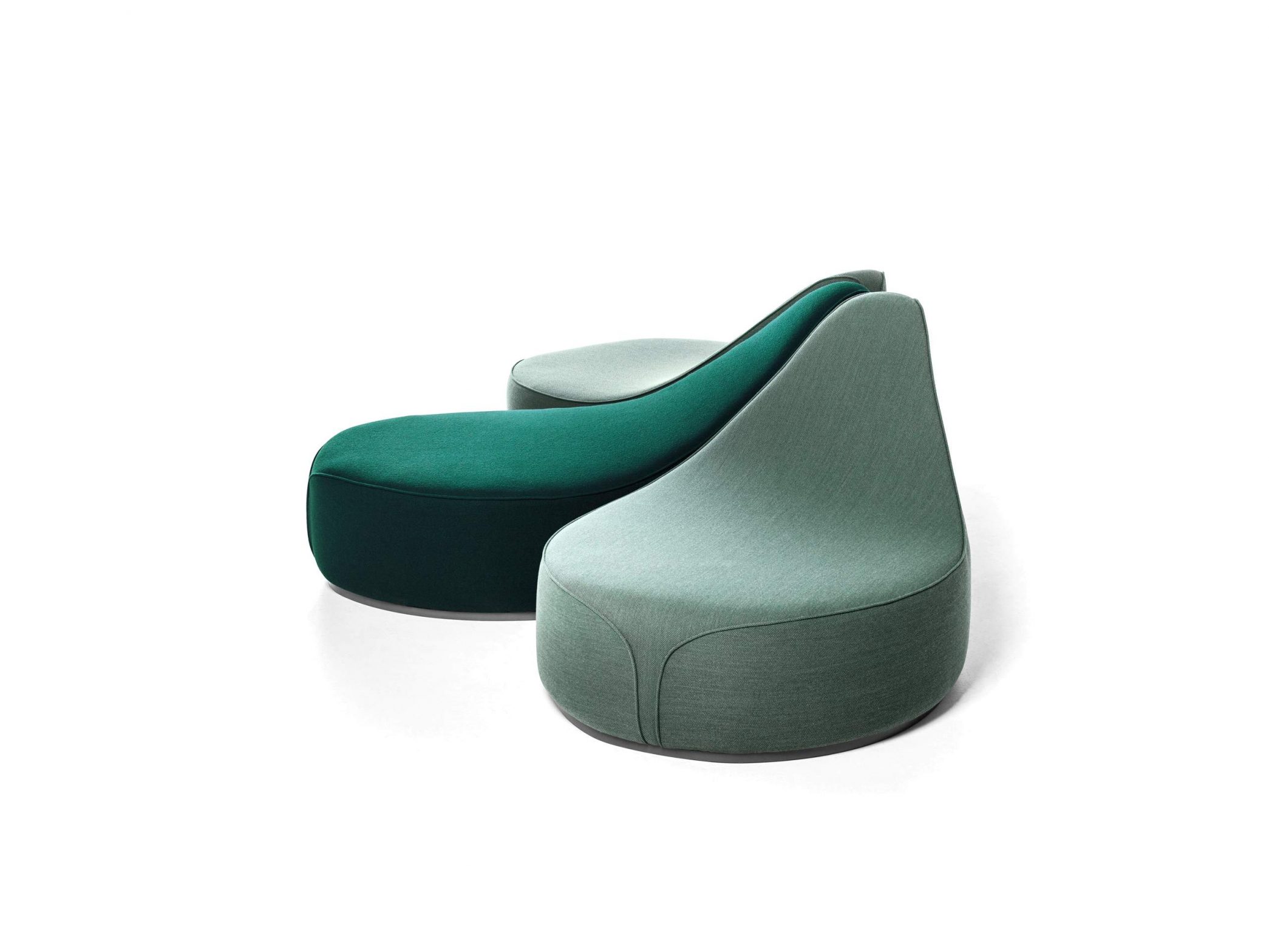 Waves poufs can be used individually, but they really come into their own in compositions. The modular items are available in a range of different shapes and sizes, including some with small backrests.