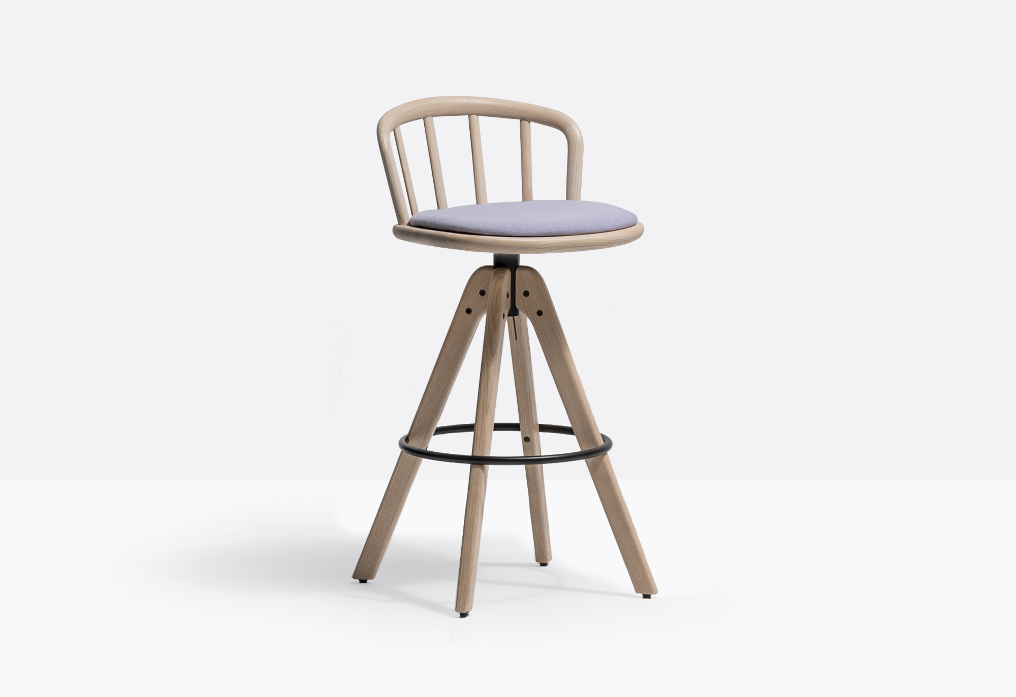 Nym barstool adopts the archetypal structure of the English Windsor chair, reinterpreting and streamlining it to reflect industrial manufacturing systems. The arched backrest in elliptical-section bentwood flows seamlessly into the shaped solid wooden padded seat to form an armrest. Trestle-style in solid ash wood with swivelling mechanism and steel circular footrest. Seat height 770 mm.