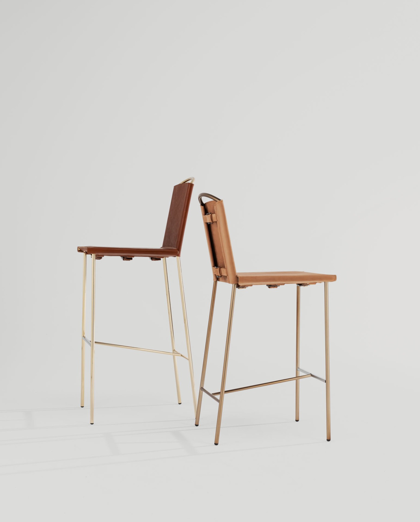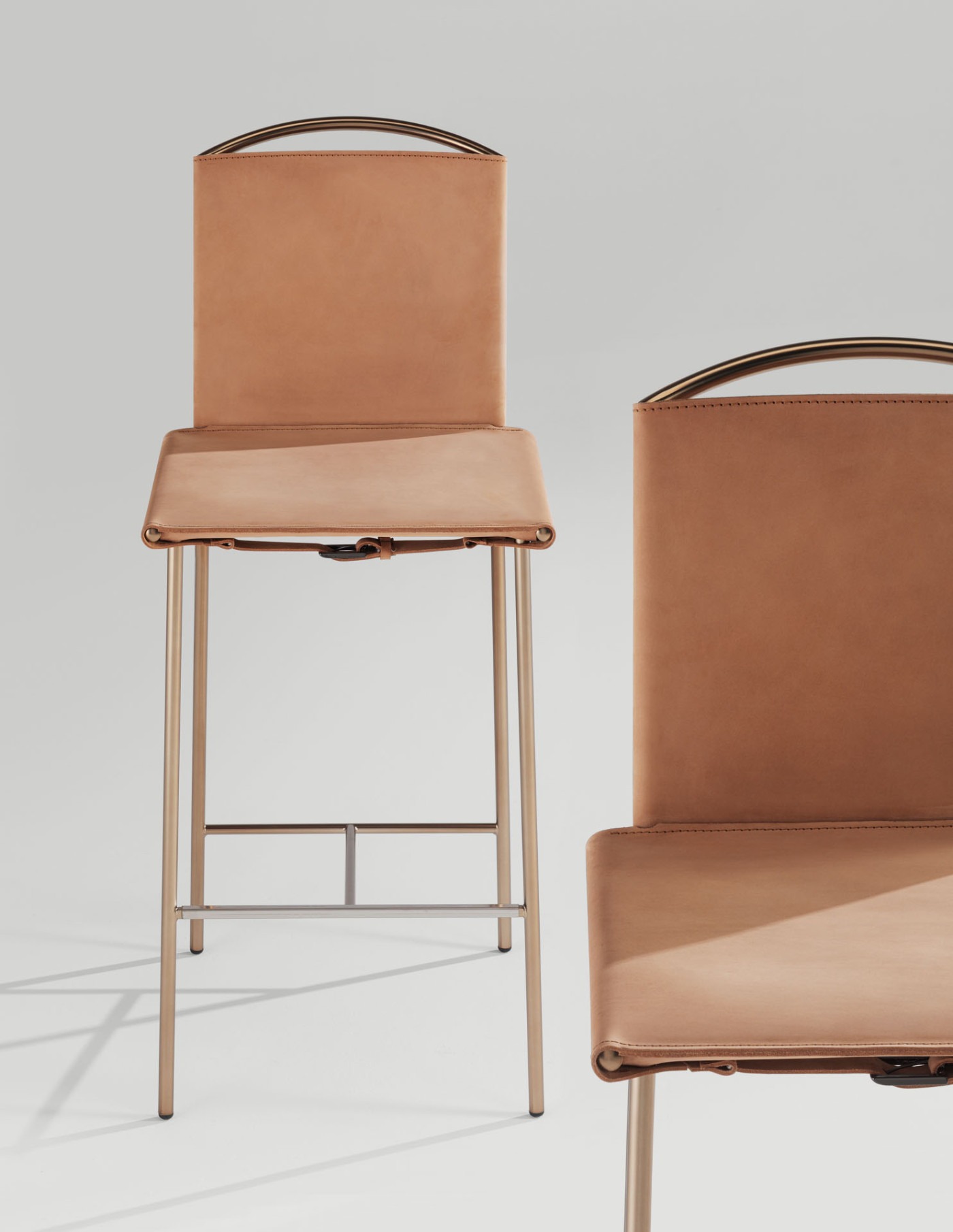 Rem stool with metal frame and upholstered in leather or Tuscan leather. Backrest with straps.