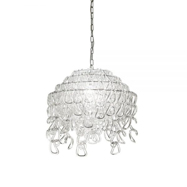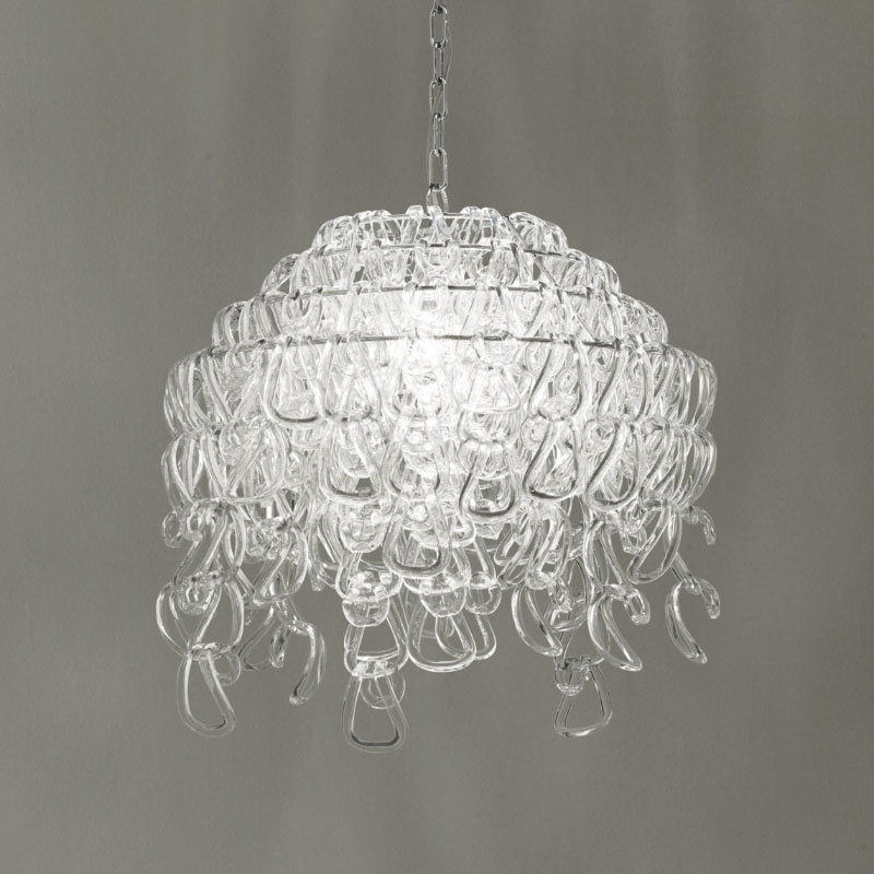 A decorative lighting system based on a single element, the handmade glass link. It is available in different colours, as standard table, floor, ceiling, pendant and wall fixture or that can be arranged to offer chandeliers and structures of any dimension.