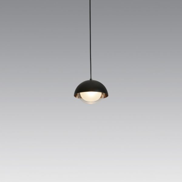 Collection of neo-vintage metal lamps with a double-sided diffuser in borosilicate glass. The metal domes (one internal and the other one external) have the internal side with different colors or finishing: they can be painted or finished in polished brass and bright copper, thus to create different textural combinations. The collection presents hanging lamps, floor lamp, table lamp, wall and ceiling. The hanging and wall lamp version are provided with a further G9 source located in the lower part of the lamp.