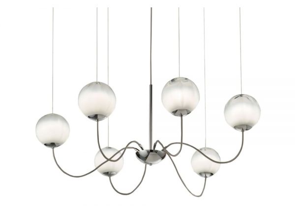 Collection of lamps with a blown and irregular striped glass diffuser. The three sizes of the spheres and the different cable heights are designed to create elegant compositions. The chandelier version allows to fix the diffusers with steel cables to the ceiling, creating different games.