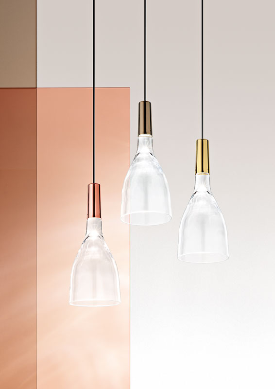 Scintilla is a classic, timeless form. The LED source lights up the sober and sinuous silhouette, creating patterns of light and emotion thanks to the full bottom of its glass cup. In its name lies the idea, the shape of the light that comes to life in the transparencies of the crystal and in the shade of white.