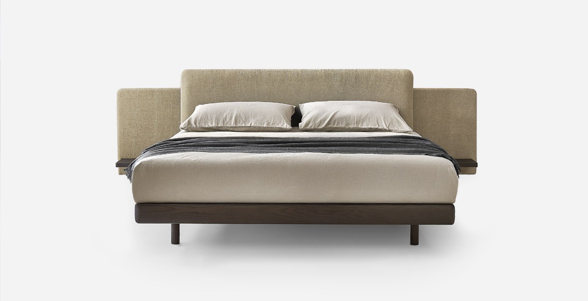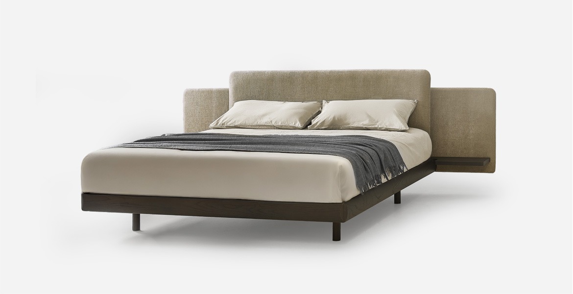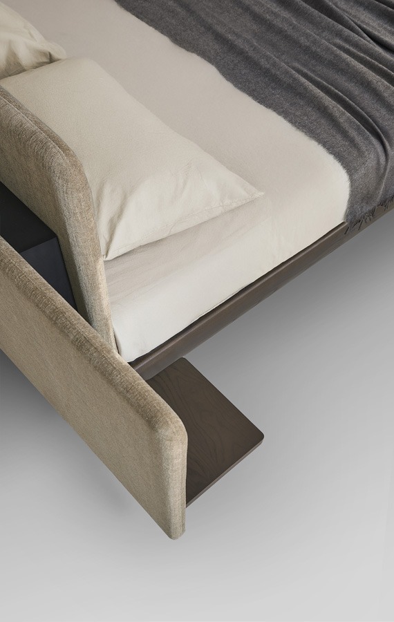 Defined by clean lines and refined details, Eos is a bed designed for contemporary night spaces. The large upholstered headboard creates an architectural backdrop with a bold yet welcoming visual impact. The Dark Ash wood frame is paired with soft surfaces, creating a balanced contrast of materials. Integrated side shelves complete the composition, offering both practicality and stylistic continuity.