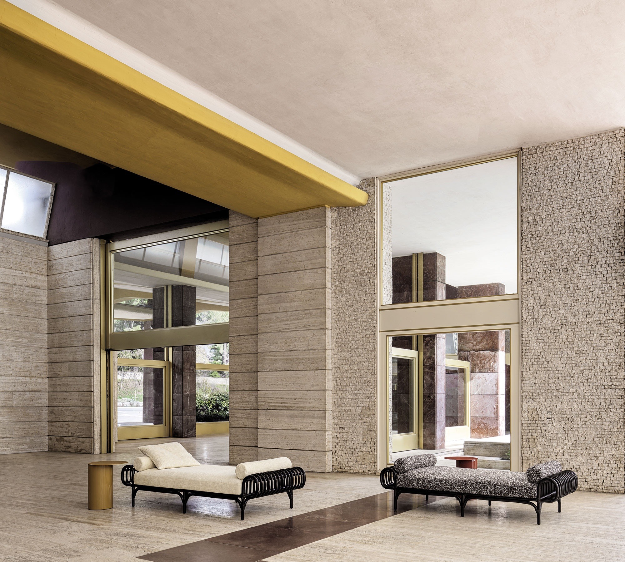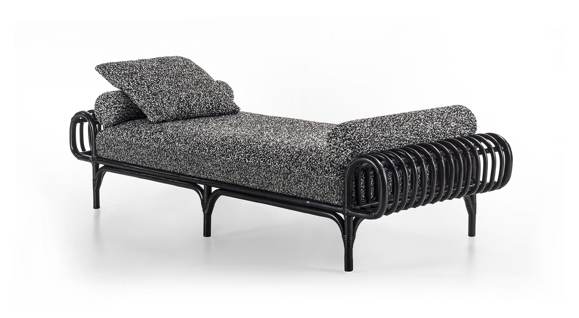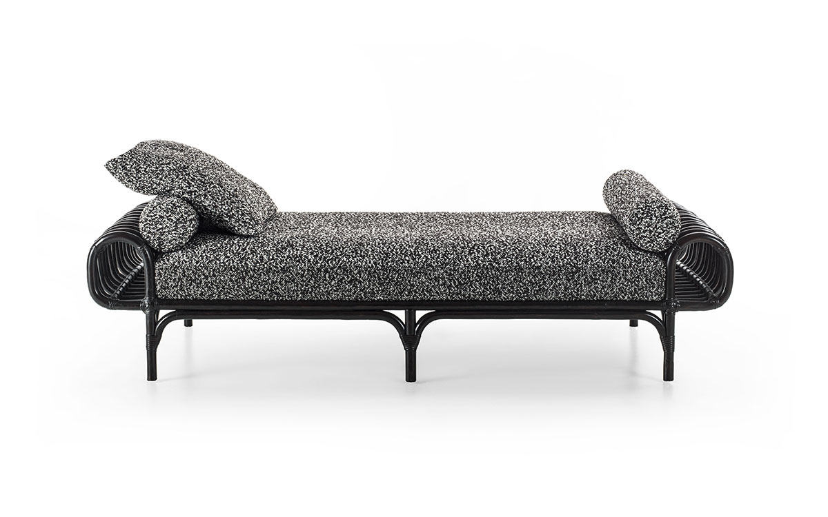 With the new Daybed Pan, Gordon Guillaumier pays homage to the great design classics by reinterpreting in a contemporary key the reed working typical of Italian craftsmanship in the 1950s and 1960s. Divertissement and memory come together in this piece, in which the natural material is steam-bent to achieve the desired curvature and then dyed dark, to enter into dialogue with contemporary indoor scenarios. With its wrap-around shape and the succession of ribs, each with a different curvature, the Pan daybed is the result of meticulous craftsmanship: its bold shape contrasting with the soft seat and back transforms it into a domestic sculpture, giving a new twist to the Frigerio living area.