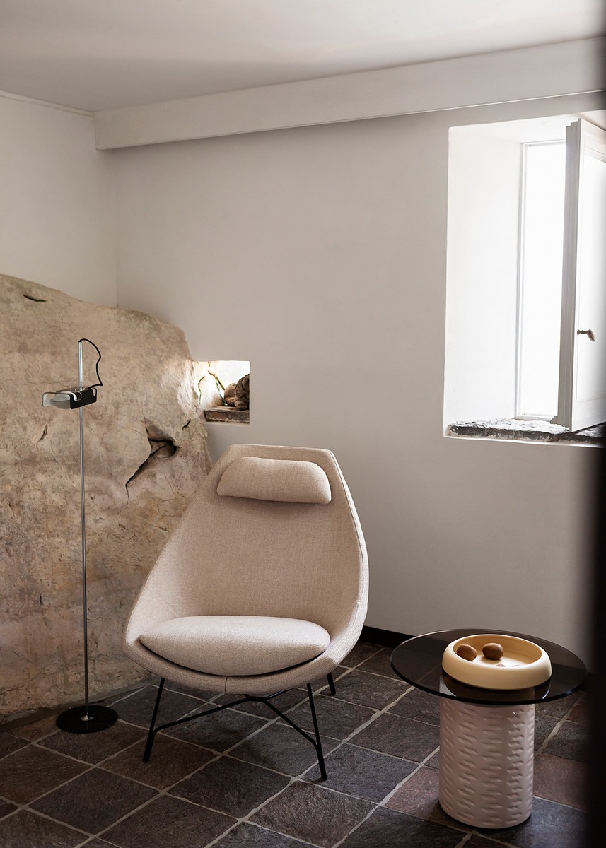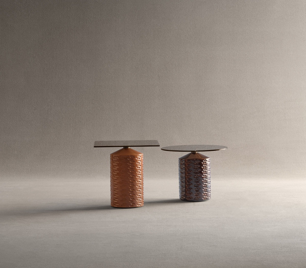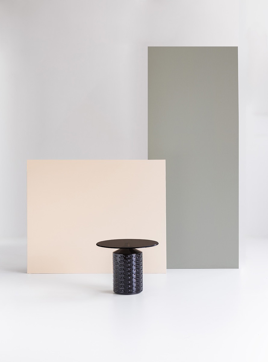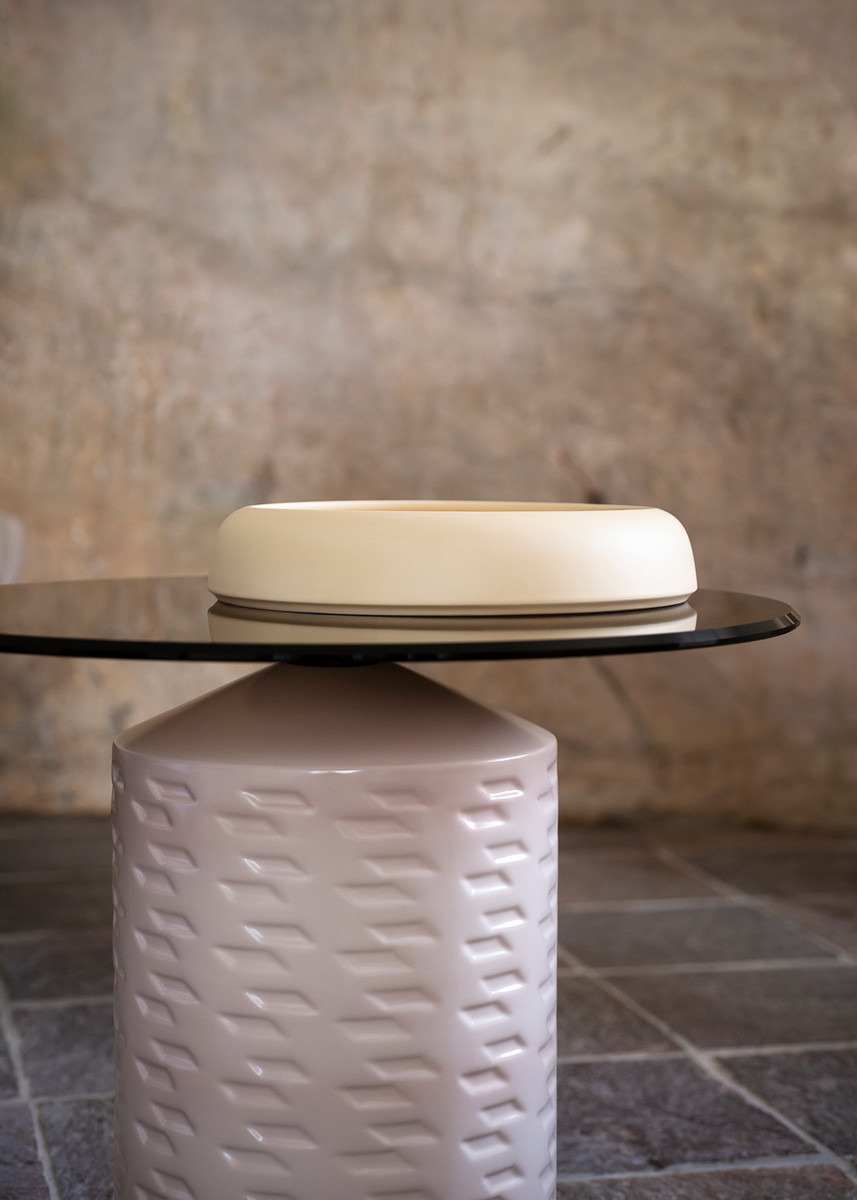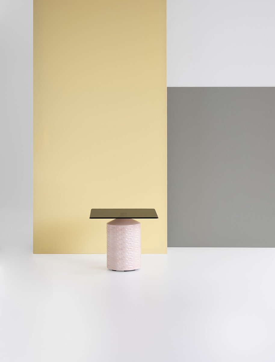 The Hishi family of side tables features a glazed ceramic base with a handcrafted geometric-patterned bas-relief decoration. The base, available in shades chocolate and peach is enriched with two new colors: a new black ceramic shade and a quartz pink hue.