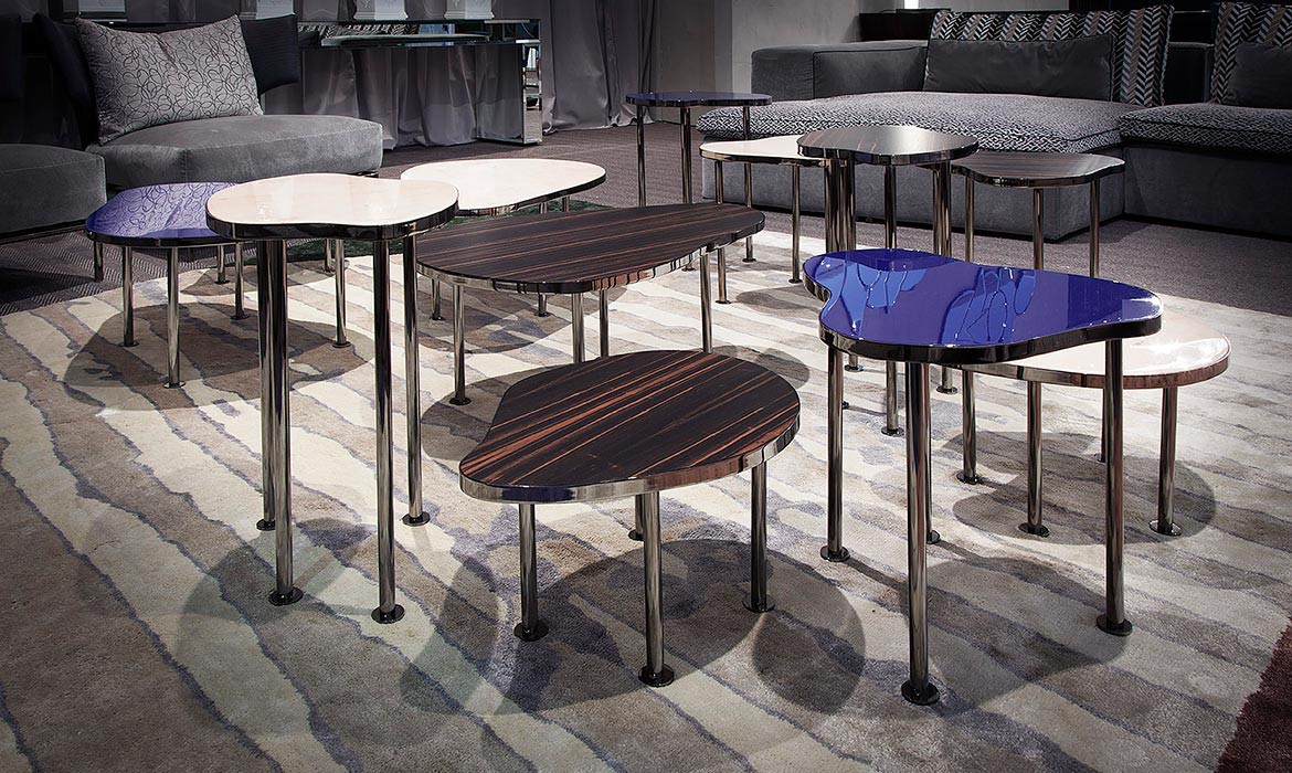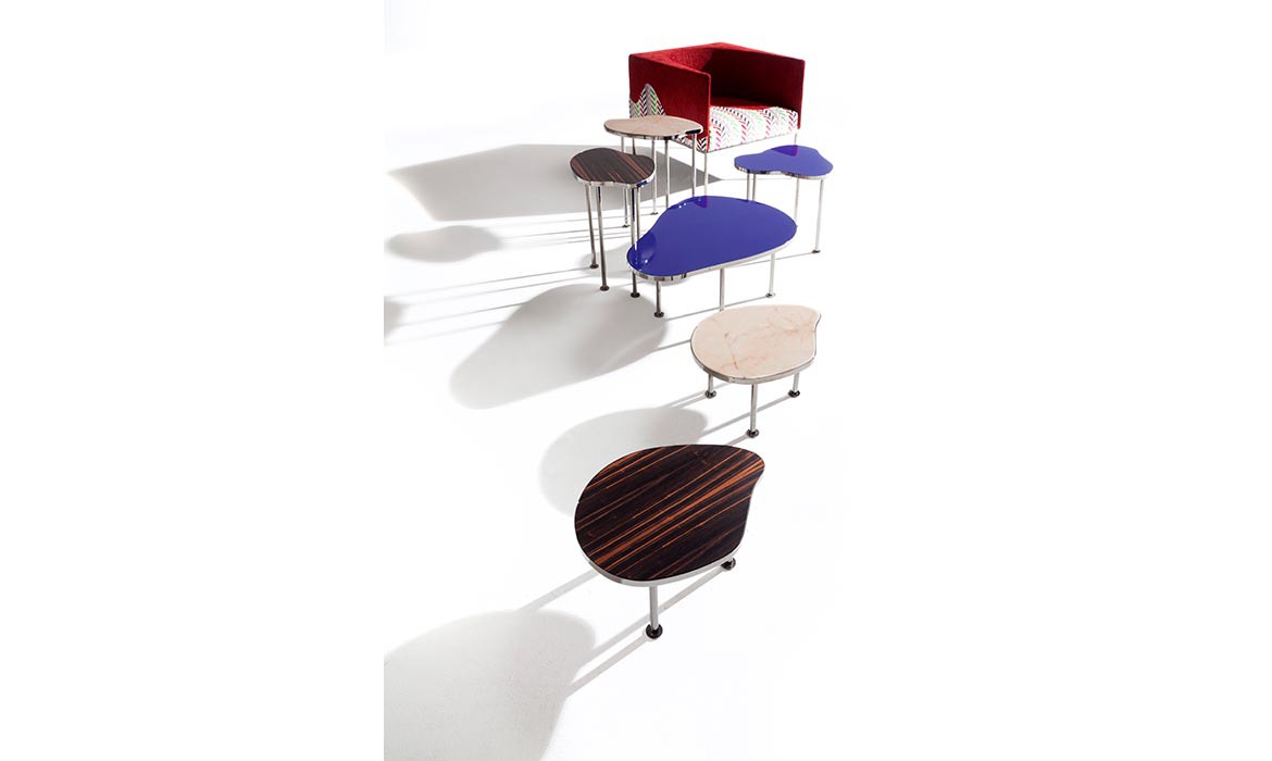Funny coffee tables, combinable, interchangeable, to be used individually or in composition.They have soft and rounded shapes and they are composed of different materials: marble (Rosa Portugal, White & Black, Black Marquinia, Port Laurent or white Carrara), natural wood (oak, Canaletto walnut and ebony) and lacquered wood (various shades of RAL )The base is made of metal, bright black chrome finish.