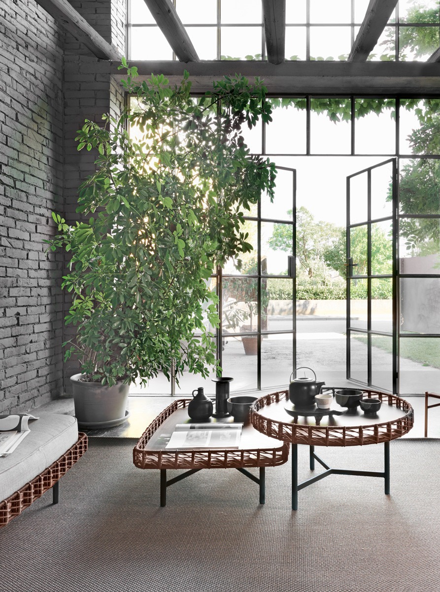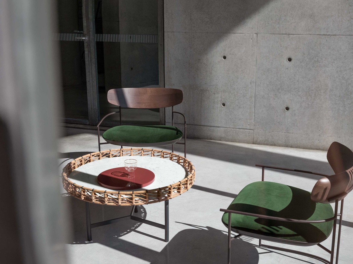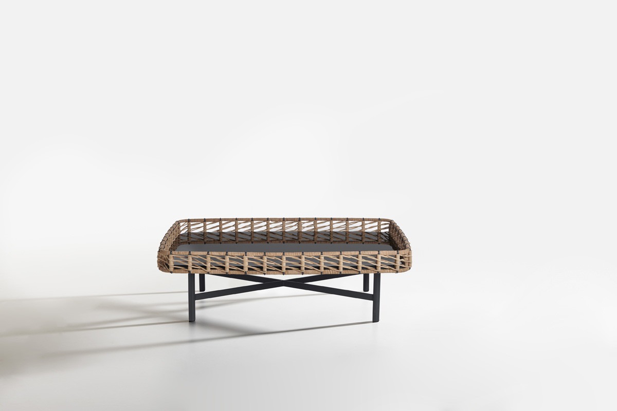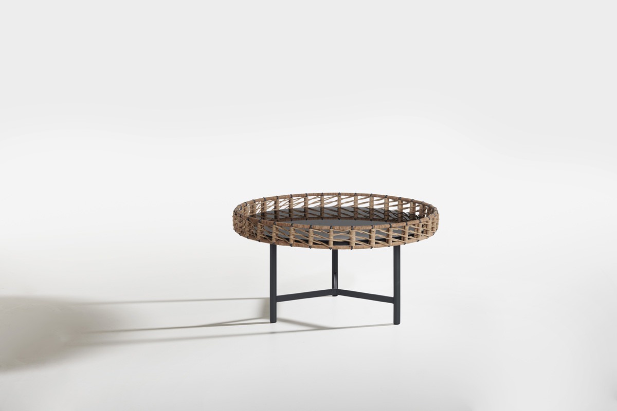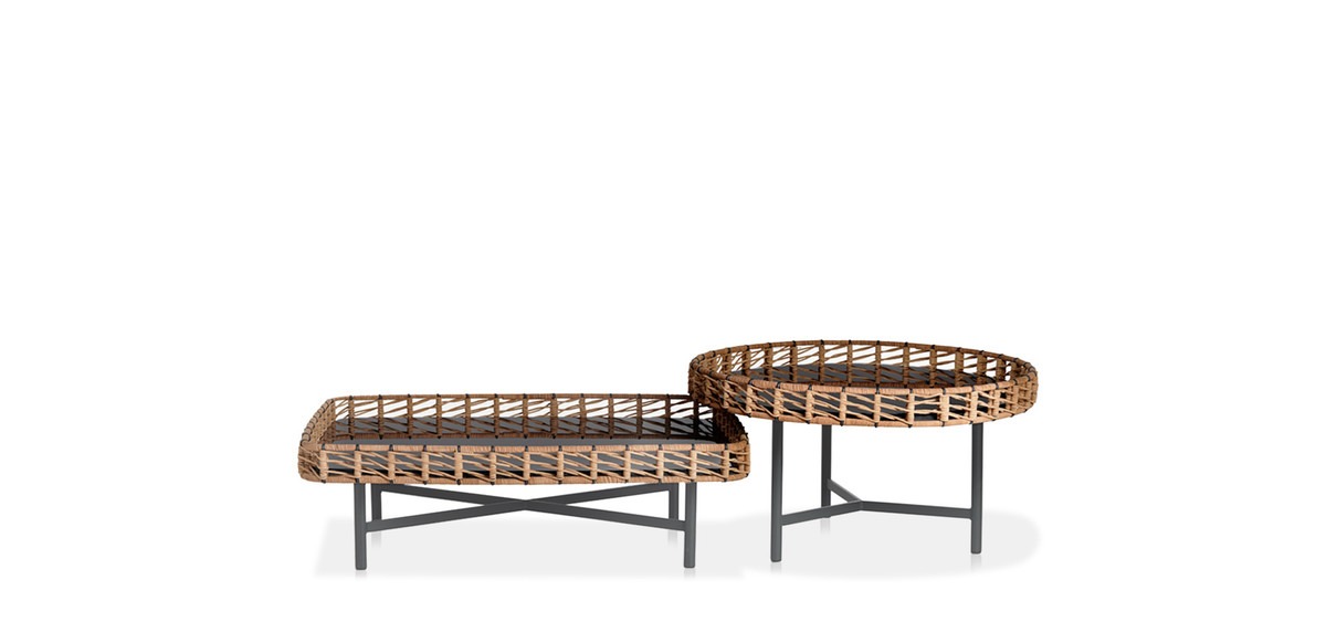 From exotic remembrances, Ropu stands out for its sophisticated woven border in hide rope, running along the perimeter structure creating a frame for marble, back-painted tempered glass, laminated porcelain and HPL tops or soft cushions with mousetail cord profiles.The Ropu coffee table is available in two versions, with high legs and round top, with low legs and rectangular top, with embossed painted metal structure and top in marble, back-painted tempered glass, laminated porcelain or HPL.