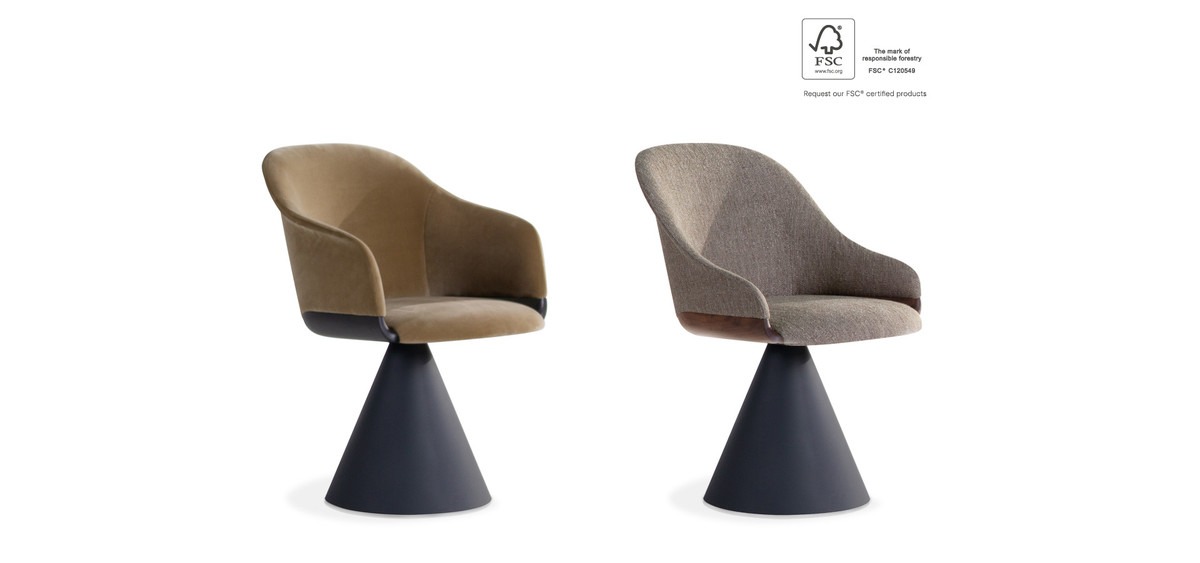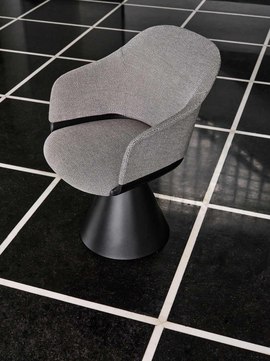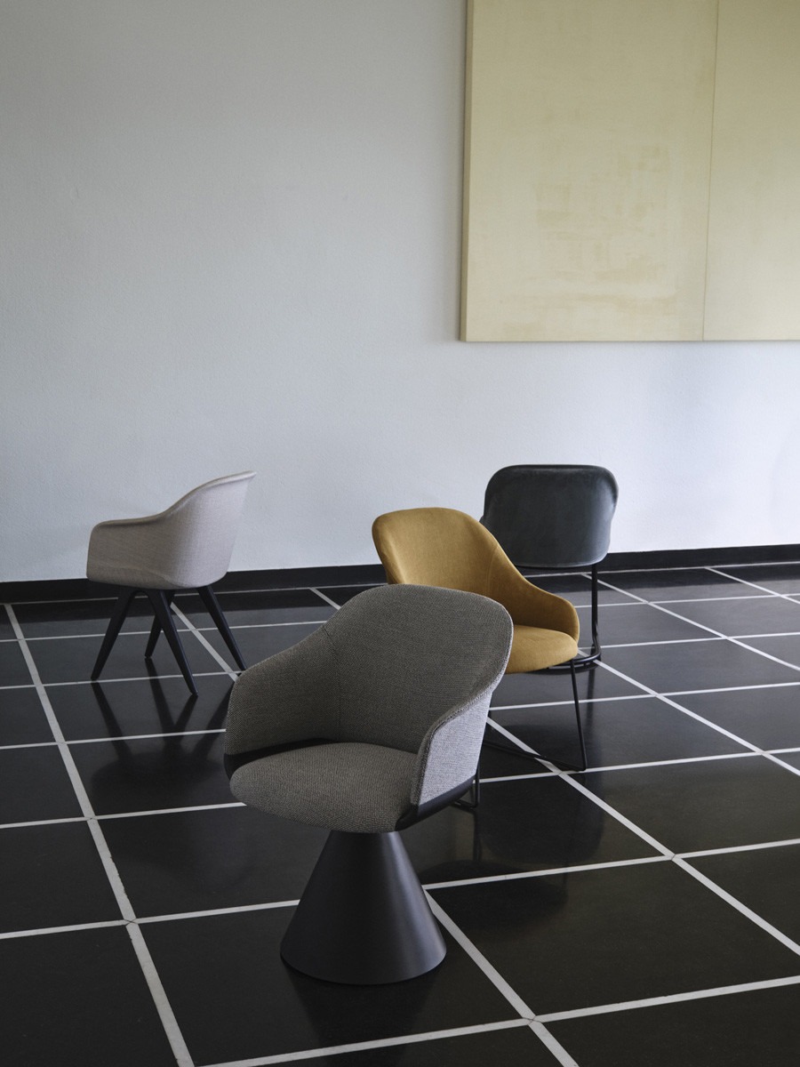 Lyz chair and small armchair show the company’s craftsmanship in working wood as a live material in relationship with different others.A relationship in which solid ash wood is the structure on which the padding comes to life.Chair and armchair with central swivel cone base in embossed anthracite or black painted metal with return mechanism.Detail at the base of the seat in ash wood, seat and backrest padded in fire retardant polyurethane foam. Finishes and coverings as per collection.