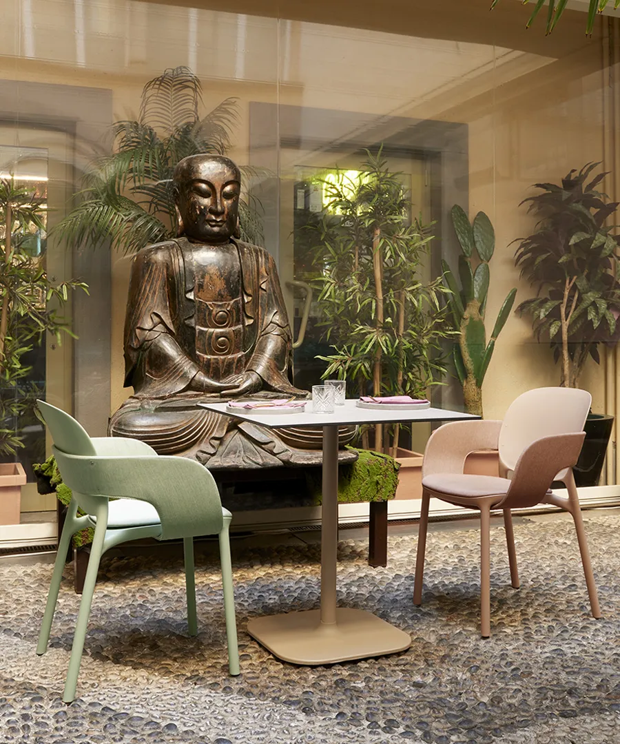 The new chair line is a return to the roots of S•CAB. This is because technopolymer was the chosen material to make it, but revised with a modern approach with the aim to be increasingly sustainable through concrete good practices in favour of the environment. HUG is therefore made with a certified regenerated Post-Consumer Recycled (PCR) material. Chair and armchair reach a higher ethical level and higher quality, giving life to a creatively green collection suitable for both indoor and outdoor environments. HUG features an extremely distinctive element: between the seat and the backrest the designers introduced a band-like element with a rounded and balanced shape, defined by a relieved striped pattern, that envelops just like a hug.