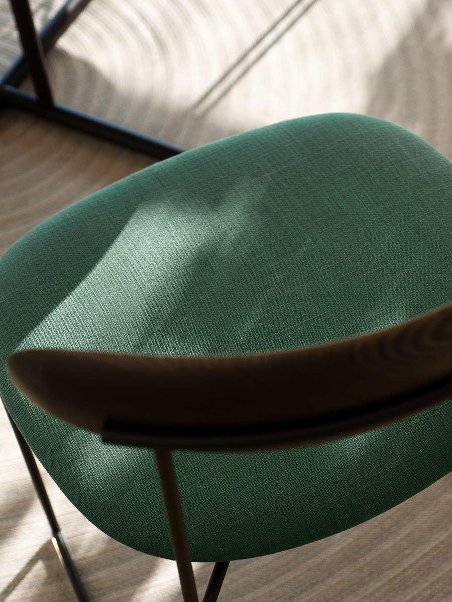 Chair and armchair, extension of the homonymous collection, were born from the research between geometric rigor and organic sinuosity.The Keel Light family has a backrest in solid ash wood, a structure in embossed metal rod painted with epoxy powders in anthracite and aval inishes, and a padded seat with a rigid underlying shell, painted acrylic for outdoors, in the same color and fine embossing of the structure.