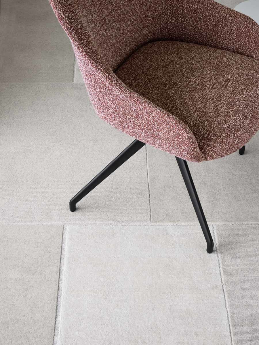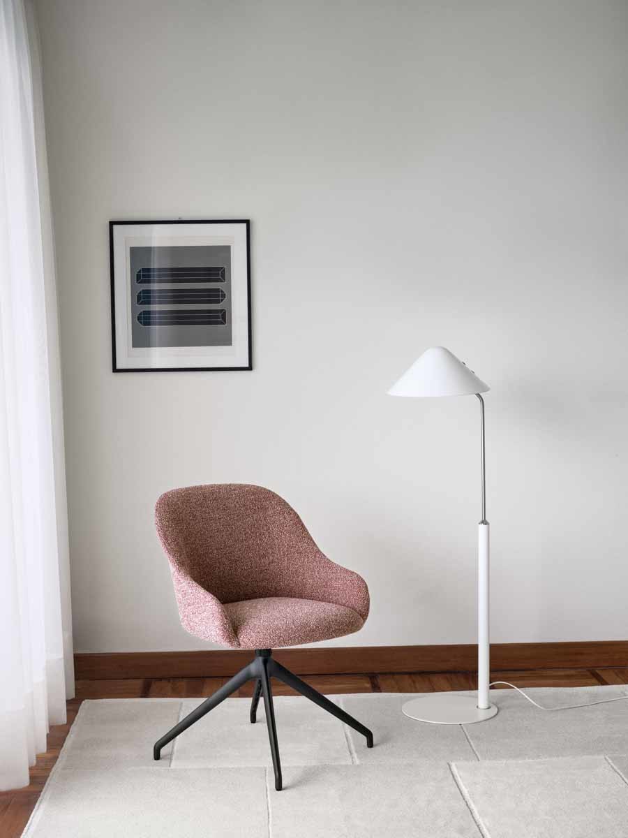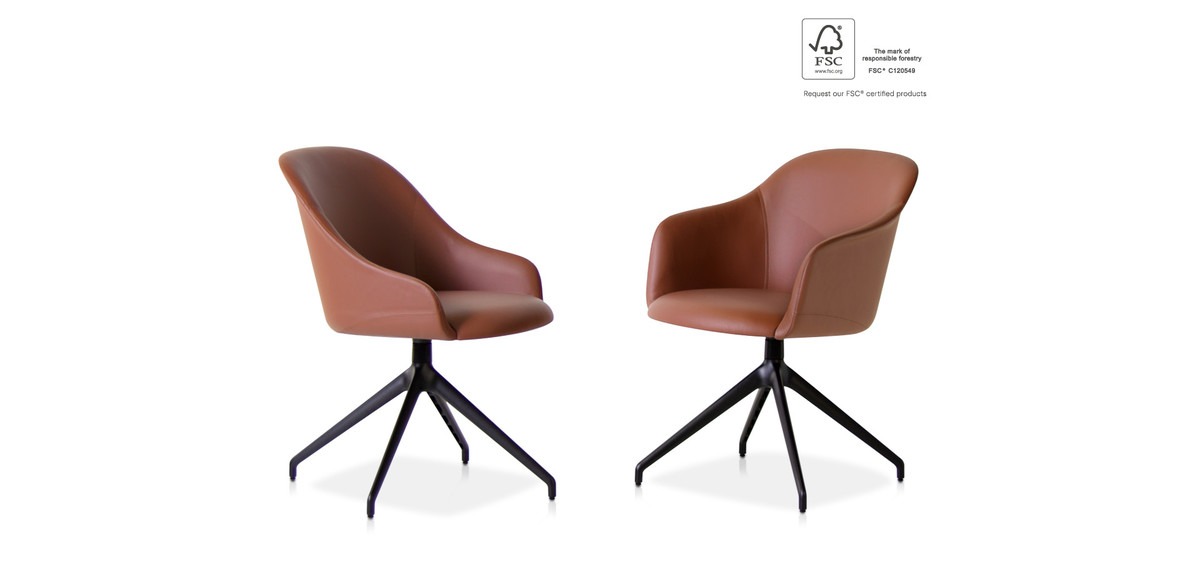 Lyz chair and small armchair show the company’s craftsmanship in working wood as a live material in relationship with different others.Chair and armchair with fully upholstered seat and backrest padded in fire retardant polyurethane foam, available with a four-star swivel base in embossed painted metal, finishes Aval or black, with return mechanism.Finishes and covers as per collection.