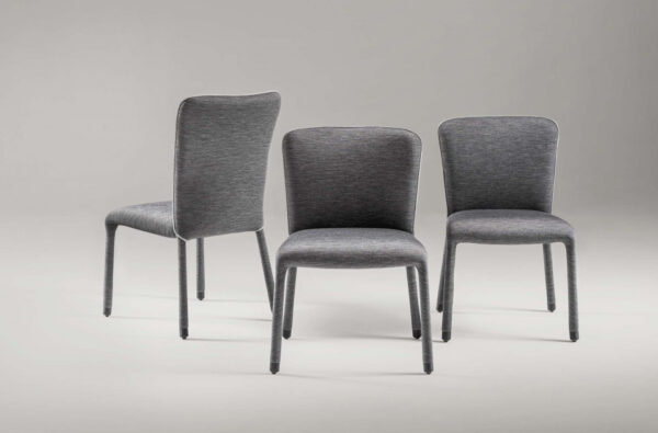 Light and dynamic, it is characterized by a continuous and harmonious line, which elegantly unites all its parts. Sinuously defined curves characterize the entire design. The backrest has a delicately enveloping shape, which widens at the top, to offer adequate support to the back and shoulders. The seat, also ergonomic, bends forward to smoothly join the legs, avoiding sharp edges and corners. An aesthetic quirk, and a connotating detail, is the external seam of the backrest upholstery. The piping follows the upper profile of the shell and runs sideways to embrace the leg, adding a sophisticated touch.
