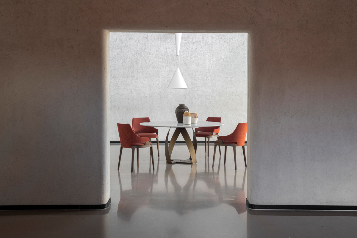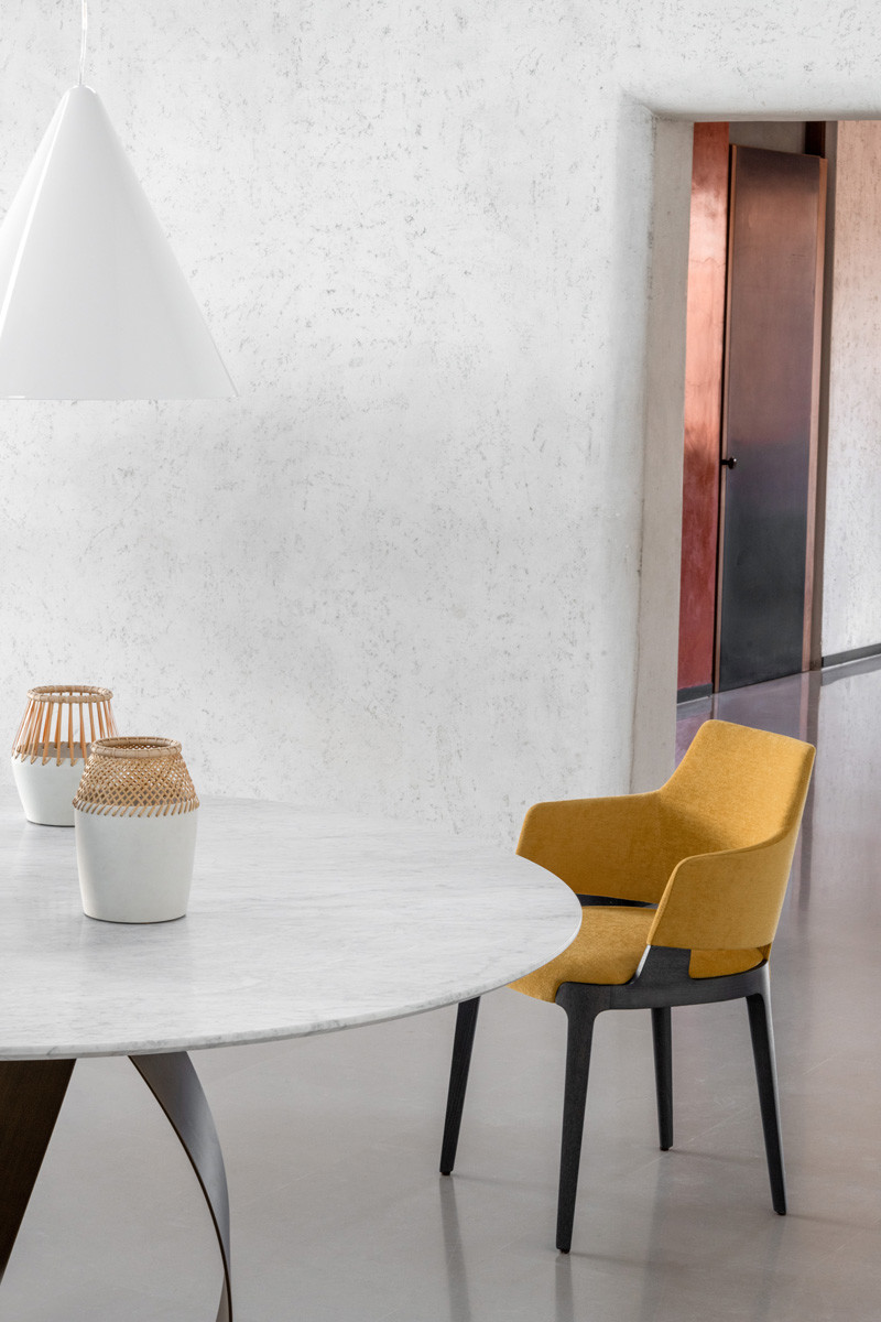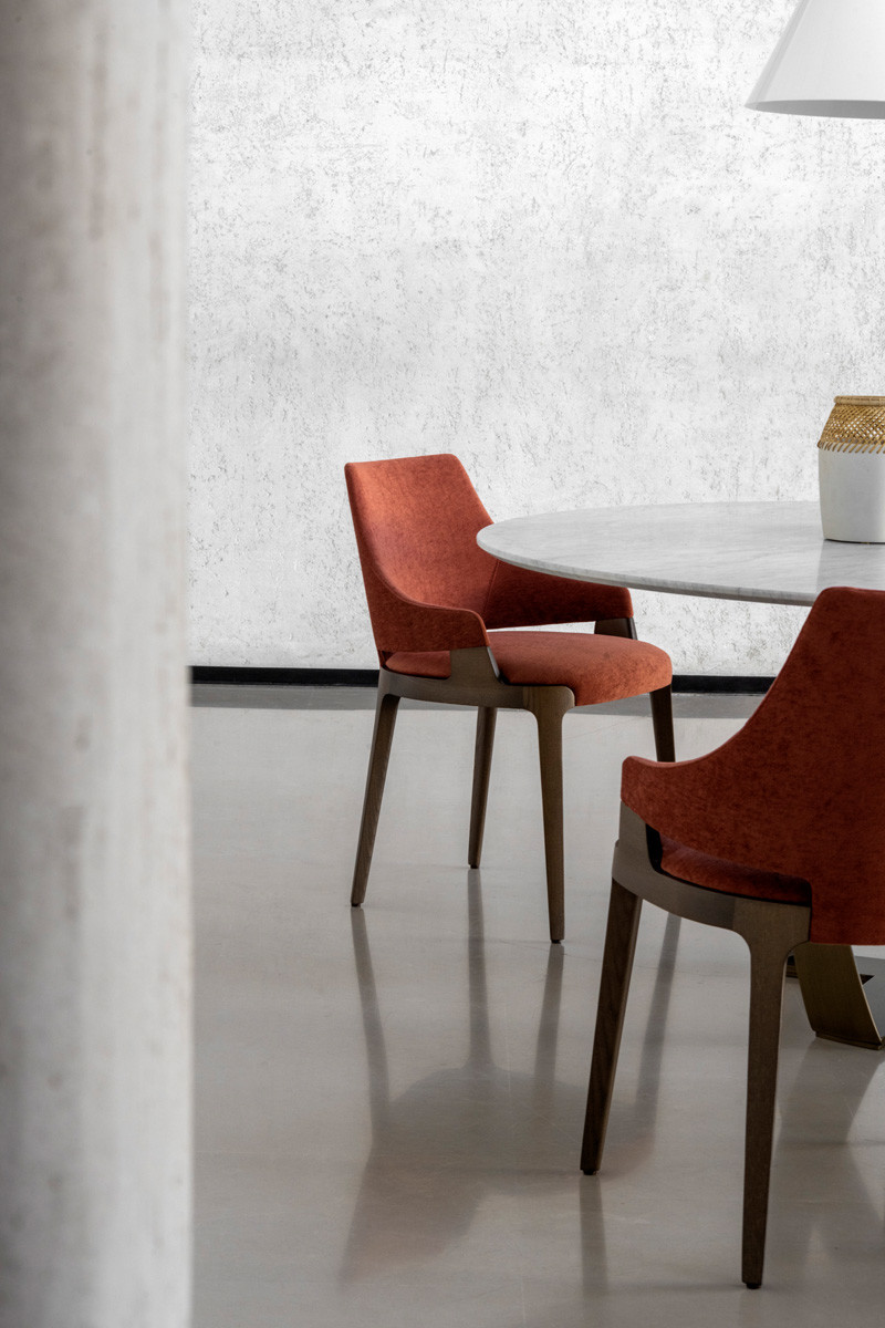 The Velis chair and small armchair are padded in fire retardant polyurethane foam with a solid ash wood or Canaletto walnut structure. Collection available also in the bi-material version