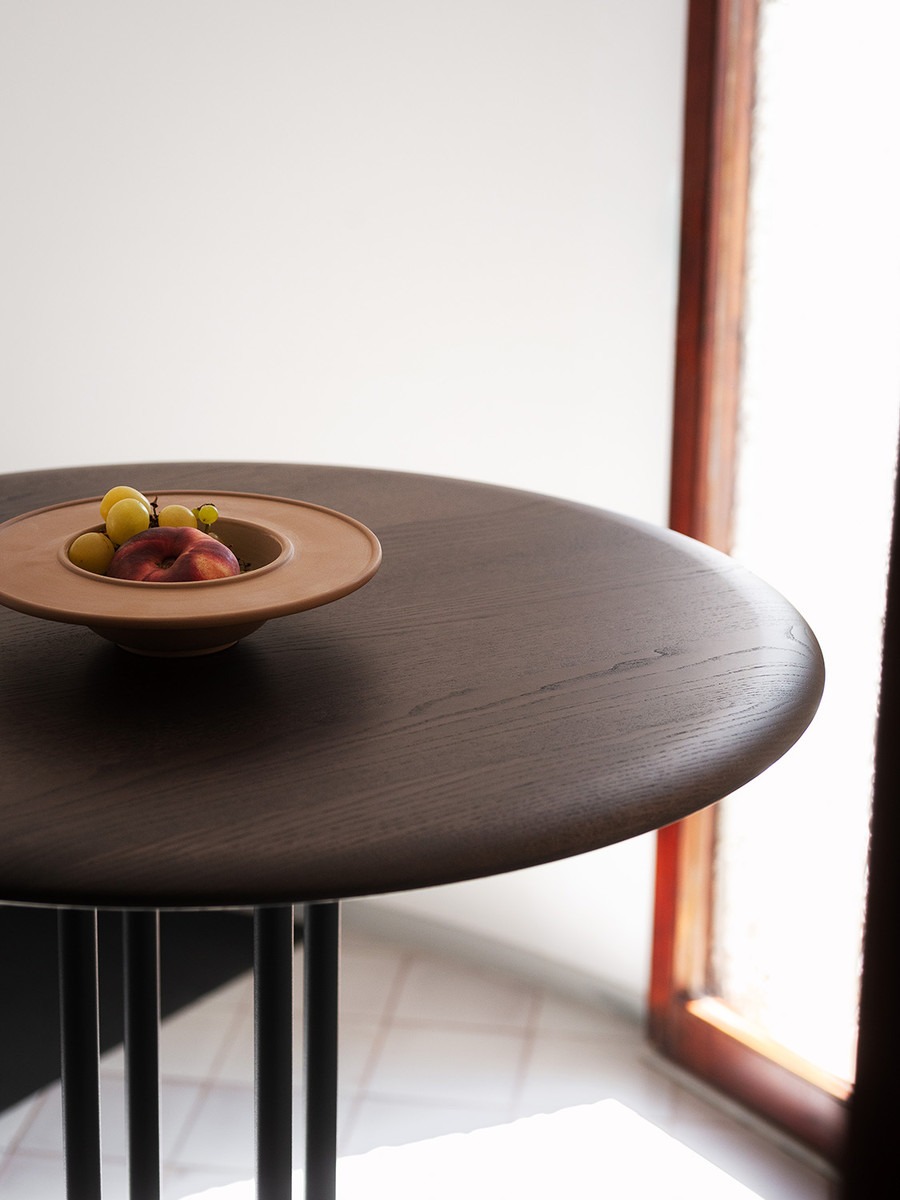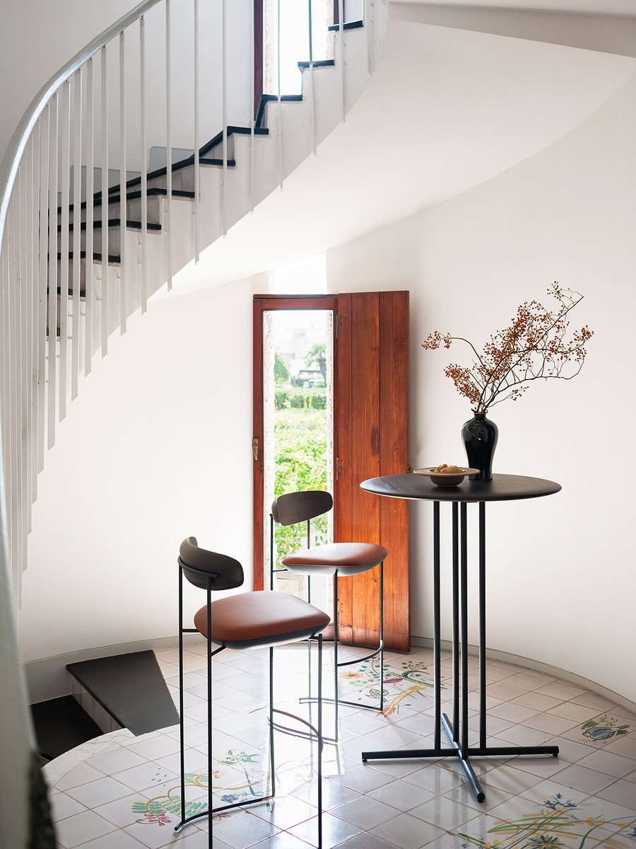The structure, composed of thin and geometrical elements, is harmoniously combined with functional surfaces, creating tables, the bench, the writing desk and complementary coffee tables.