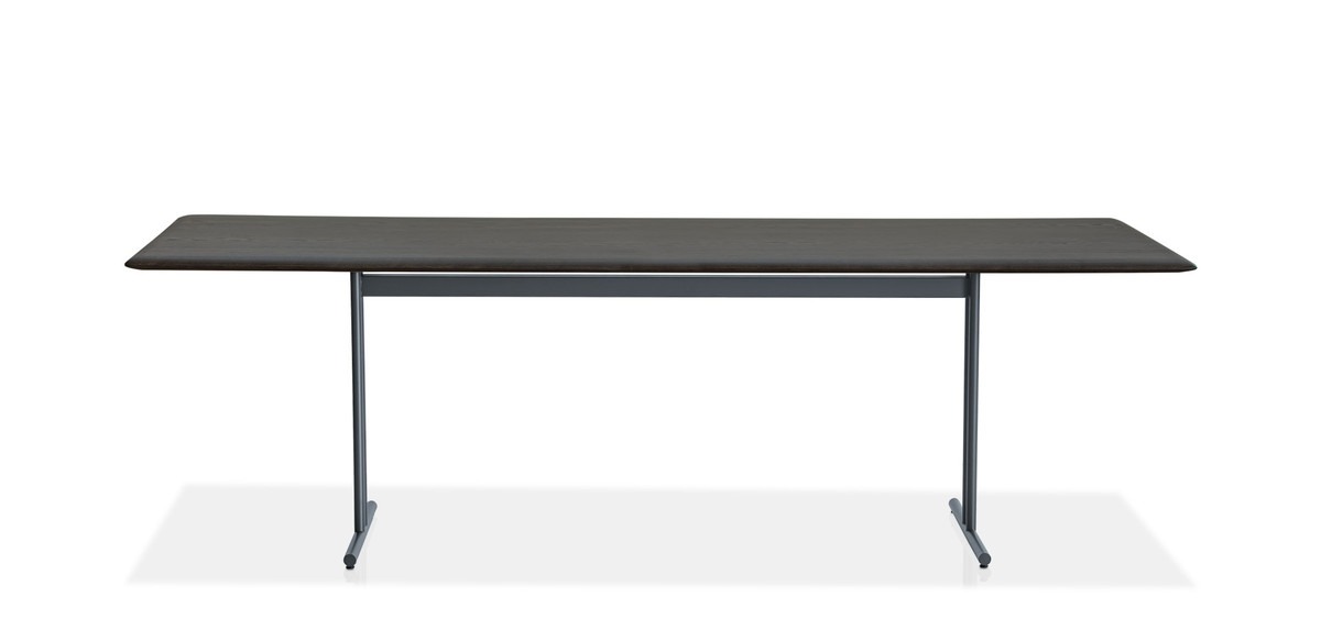 The structure, composed of thin and geometrical elements, is harmoniously combined with functional surfaces, creating tables, the bench, the writing desk and complementary coffee tables.