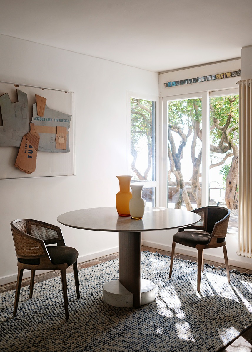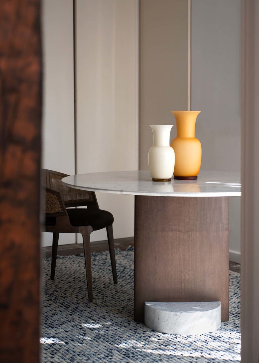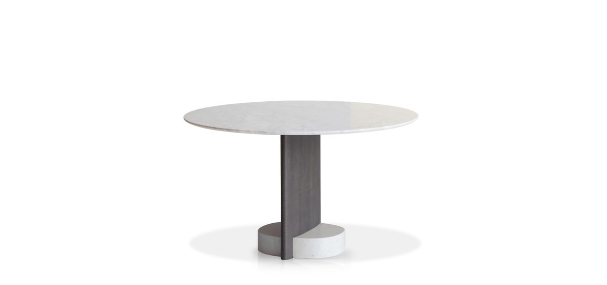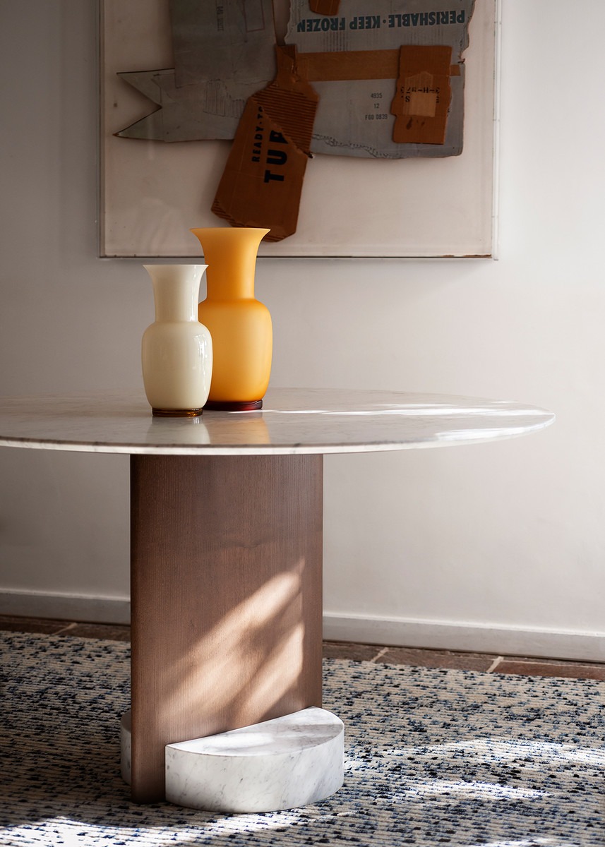 The Syn collection investigates the relationship between multiform volumes that combine to create a unique piece of furniture. This family is declined in two dining tables, with round and rectangular tops, whose protagonist is the base composed of an interplay of shapes and materials.