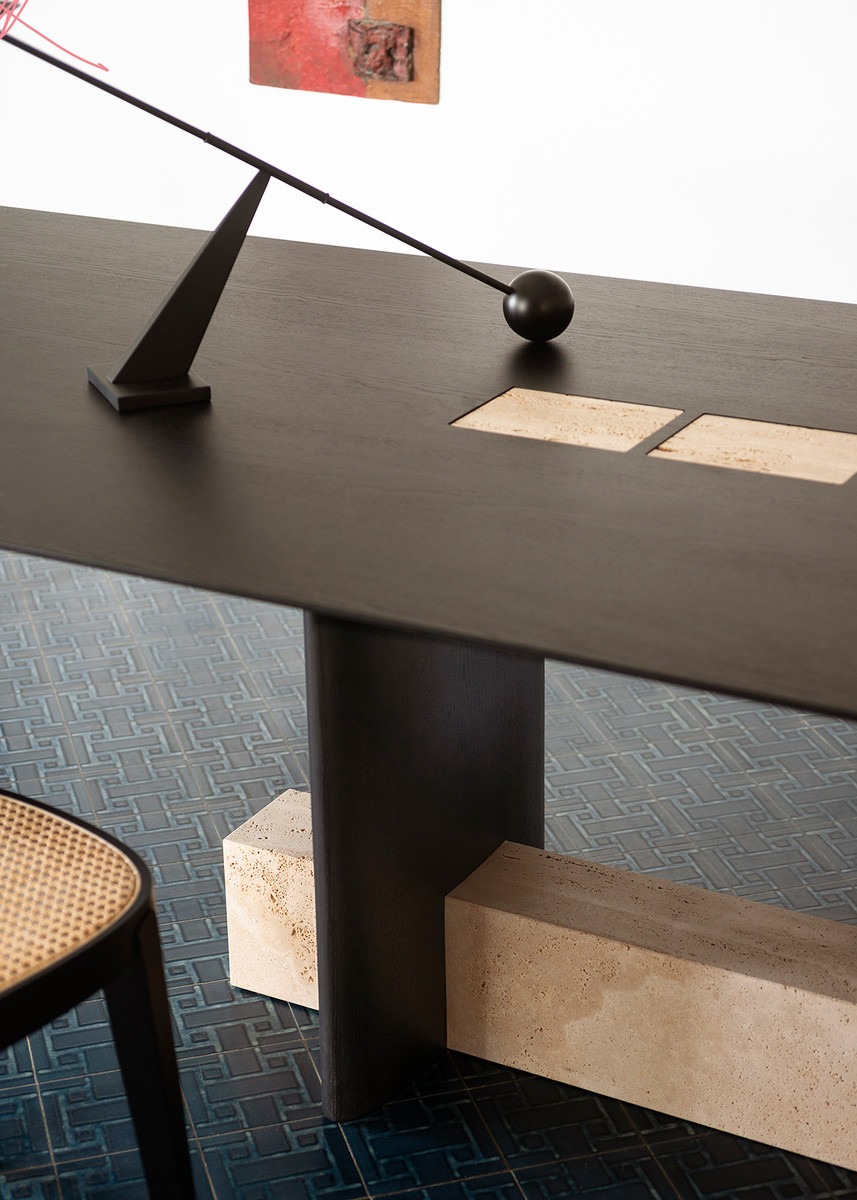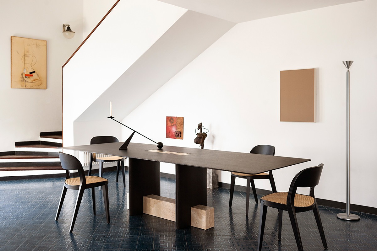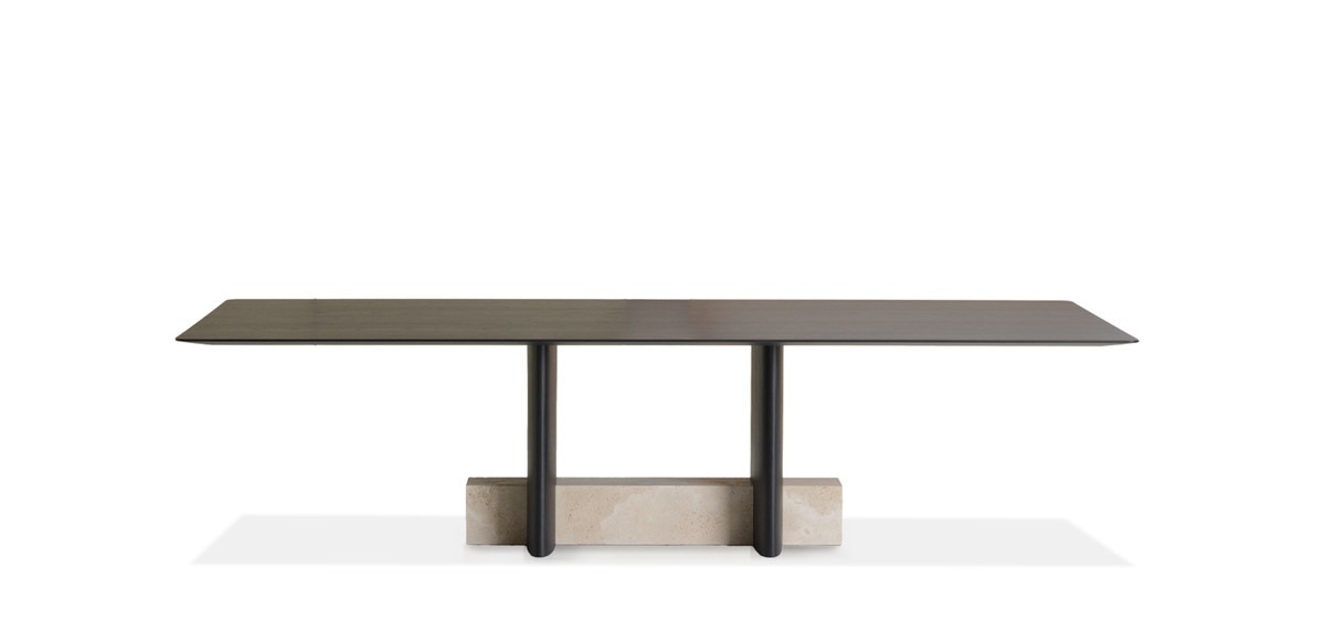 The Syn collection investigates the relationship between multiform volumes that combine to create a unique piece of furniture. This family is declined in two dining tables, with round and rectangular tops, whose protagonist is the base composed of an interplay of shapes and materials.