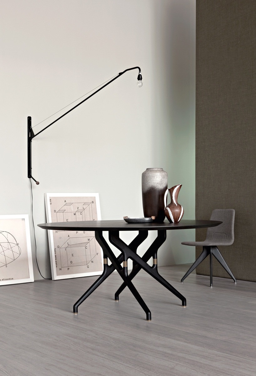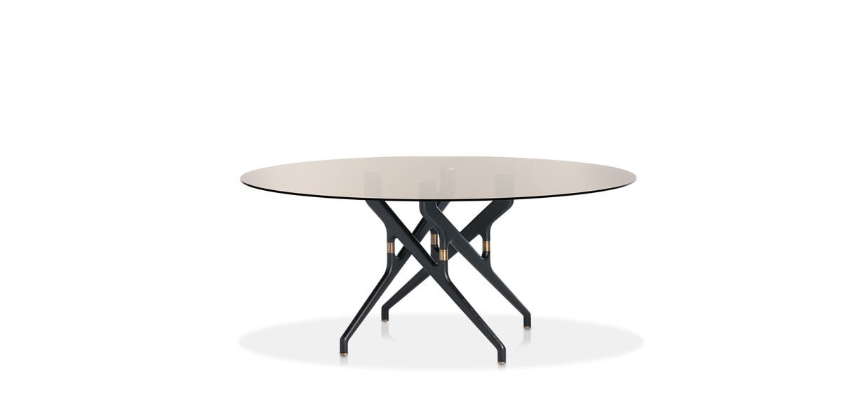 Family of tables and up & down stool.Wooden crosses that rise on delicate metal feet characterize the tables of the Torso collection.A project that is both essential and sophisticated, a divertissement with which the company freely expresses its mastery in woodworking by bending the material to its will.Round table with structure in solid ash wood or Canaletto walnut and details in bronzed brass. Available with single structure. Top in ash wood, Canaletto walnut and bronzed tempered glass.