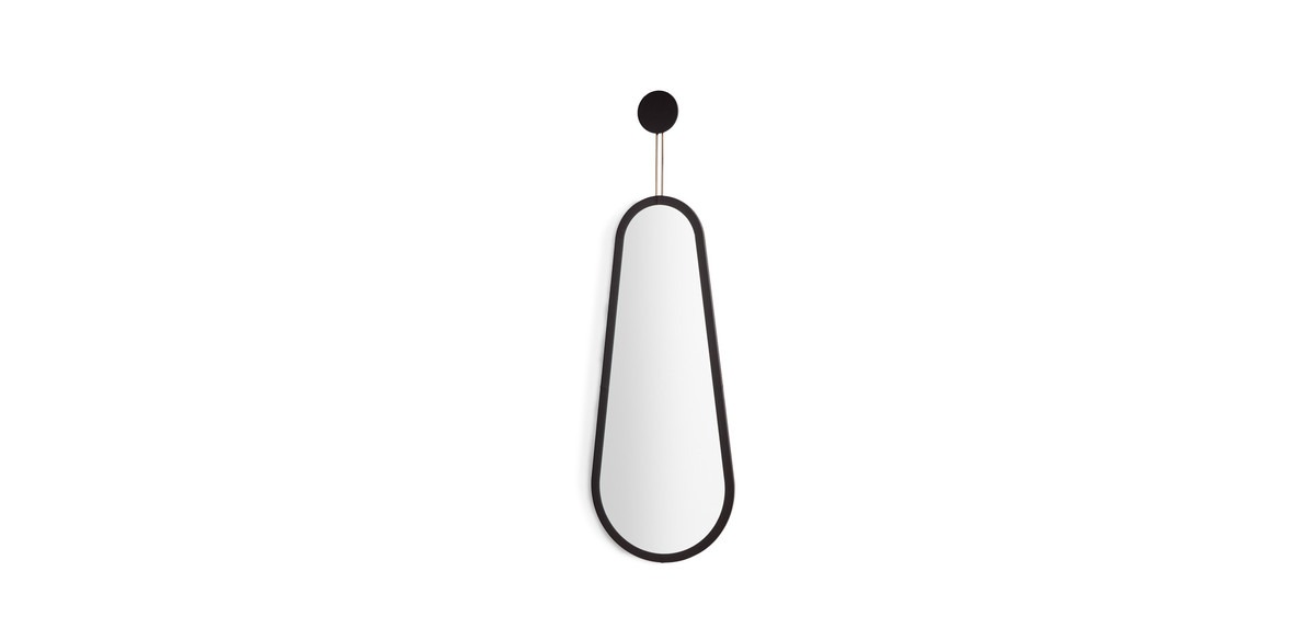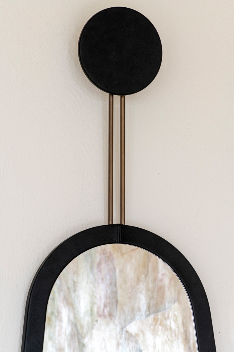 Stilla is a wall mirror that gets inspiration from the shape of crystal pendants, echoing the traditional drop cut of precious stones.A distinctive furniture accessory that selects sophisticated finishes: the profile of the mirror and the circular attachment part are covered in leather in the colors as per collection, while the two metal rods are in bronzed brass.