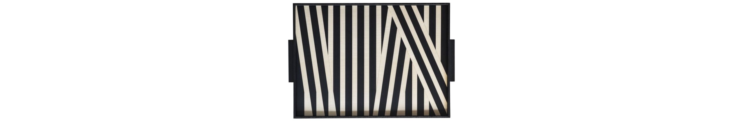 The age-old art of marquetry comes back to life in these two trays, which reinterpret ancient and precious wood- working techniques. Like in a Renaissance workshop, the graphic designs and geometrical patterns of Tarsia trays are created by hand, placing together different pieces of the same material, cut according to a precise design and masterfully assembled within a simple, linear frame.