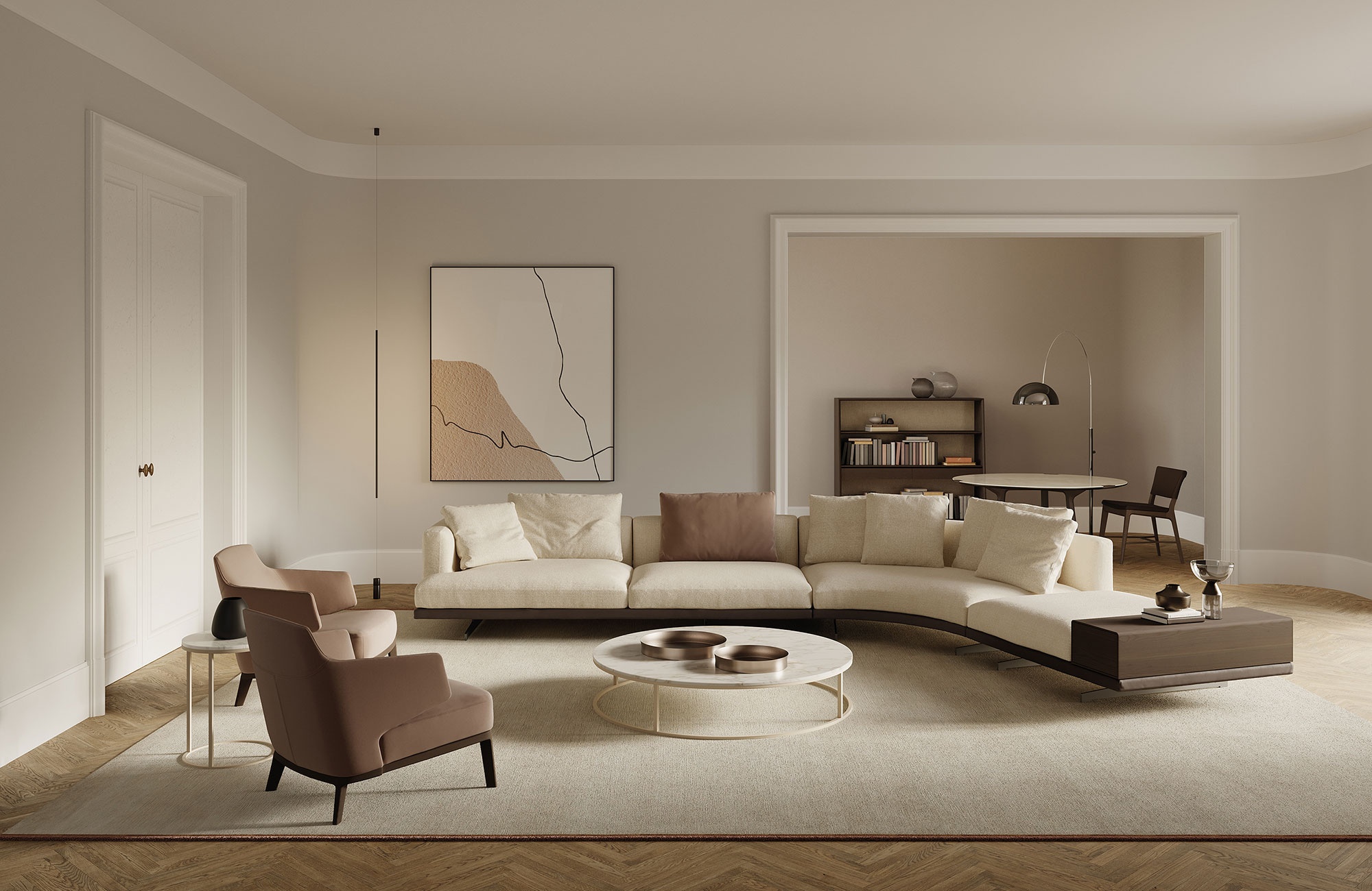 The armchair Amanda with a base in solid wood and covered in leather or fabric, features a high versatility: it is, in fact, possible to choose different finishes for the cover also by mixing different materials such as fabric and leather. The structure features an enveloping suspended armrest which starts directly from the back without a continuous line with the seat, for a dynamic and modern effect. The peculiar production of the back cover with a stitching at mid-height, highlights the tailoring attention of Frigerio by reaching his maximum expression in the leather version with stitching tone-on-tone. The collection is completed by a coordinated stool and by the bergère version.