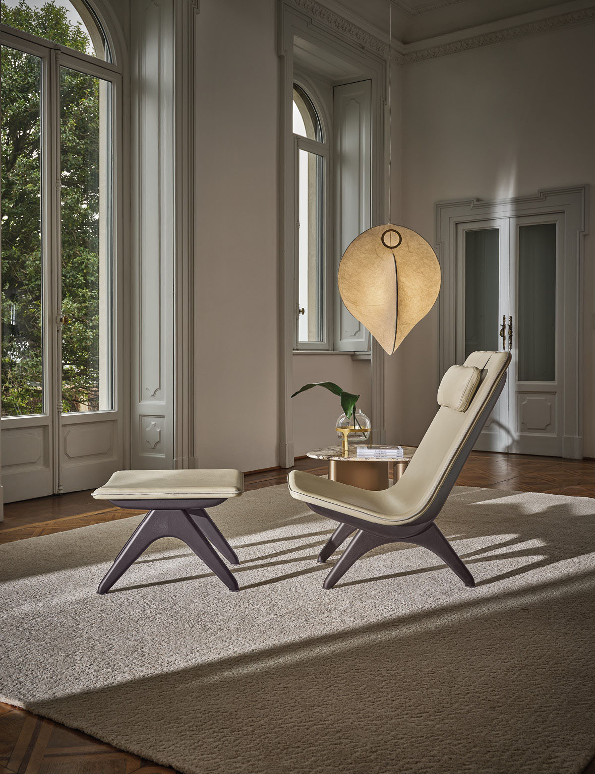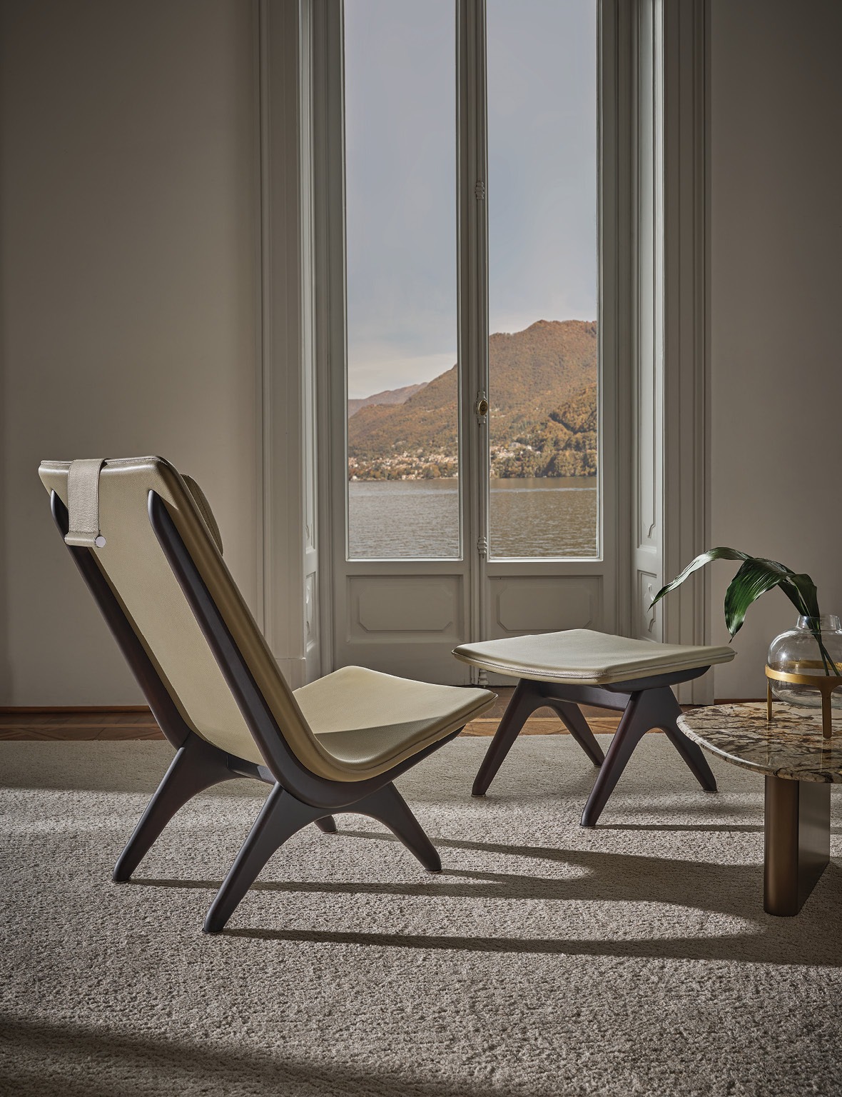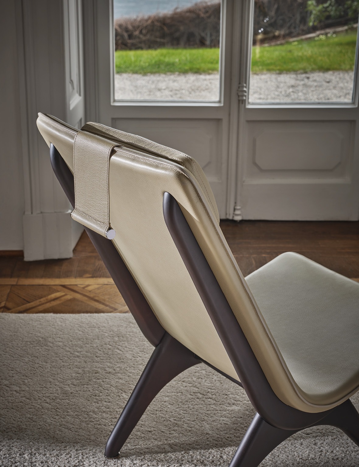 Koko is a small armchair with ottoman that stands out for its balanced balance of rigidity and ergonomics, strength and lightness, design and functionality. The structure supporting the seat is made of solid Canaletta walnut, which not only provides a solid base but also embraces the seat itself, creating an enveloping effect for moments of comfort and relaxation. The essence is surmounted by an anatomical shell moulded with a layer of polyurethane fixed to the wooden structure. The shell encloses in a single element the function of seat and back, without solution of continuity, and can be customised in the fabrics and leathers in the Porada catalogue. The product’s comfort is also facilitated by the presence of a height-adjustable padded headrest, tone on tone with the shell and characterised by details in black chrome metal, a finish that is also found in the feet. Koko is a product that blends elegance and comfort and encompasses an aesthetic represented by the use of fine materials and a design that pays attention to detail.
