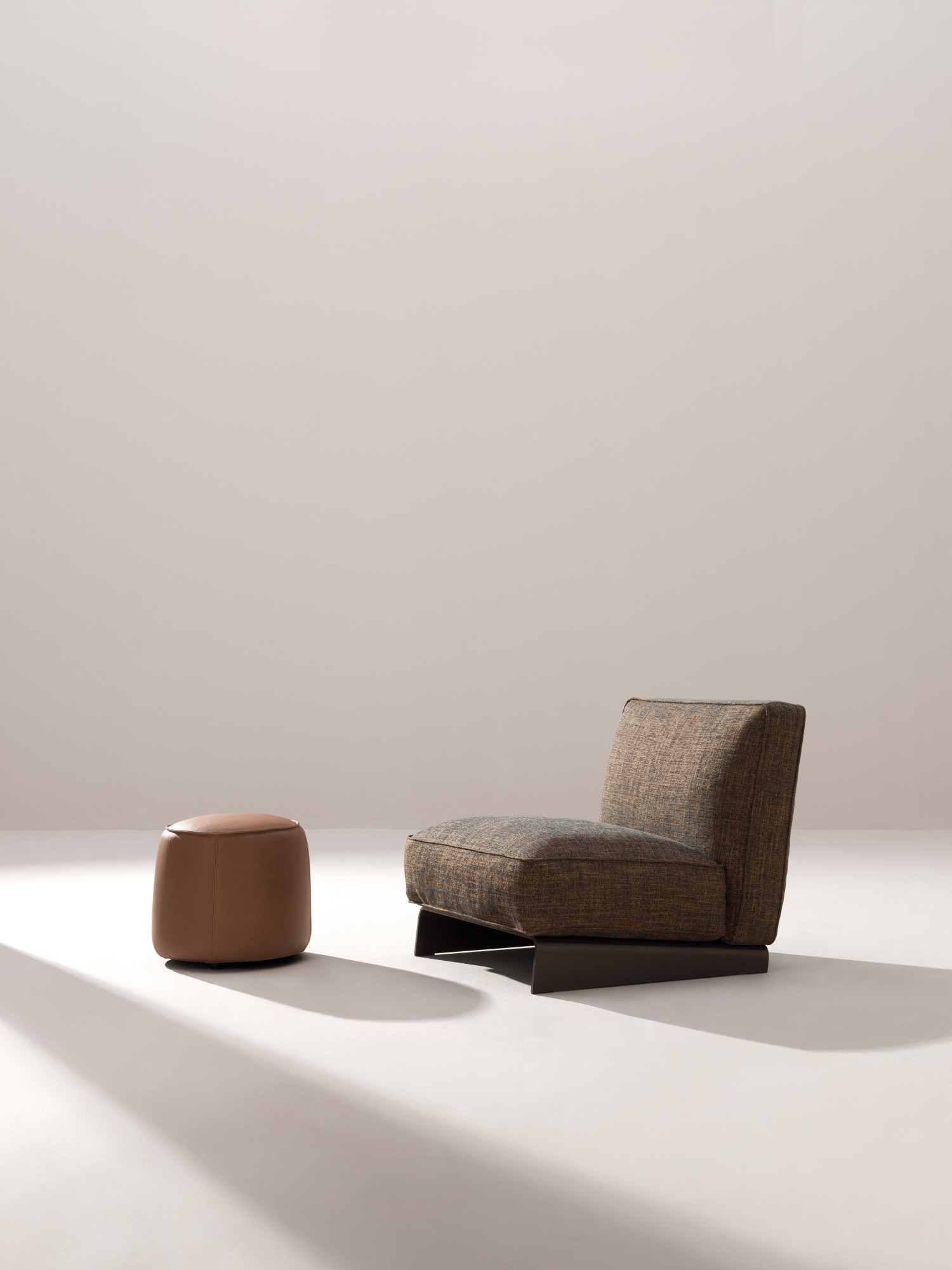 The Tor armchair is made up of two soft, squareshaped upholstered elements for the seat and backrest that welcome you to delight in their comfort.The base consists of a curved plate in matt coal grey painted metal.